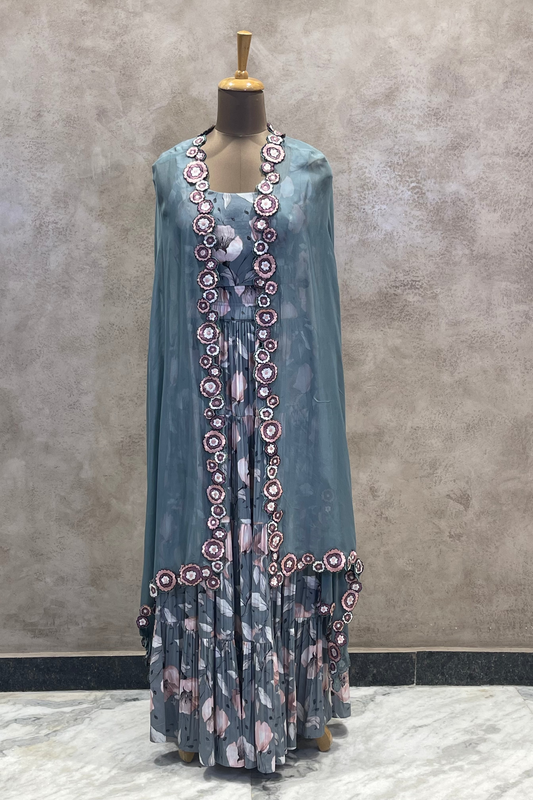 Grey Floral Printed Cape Set