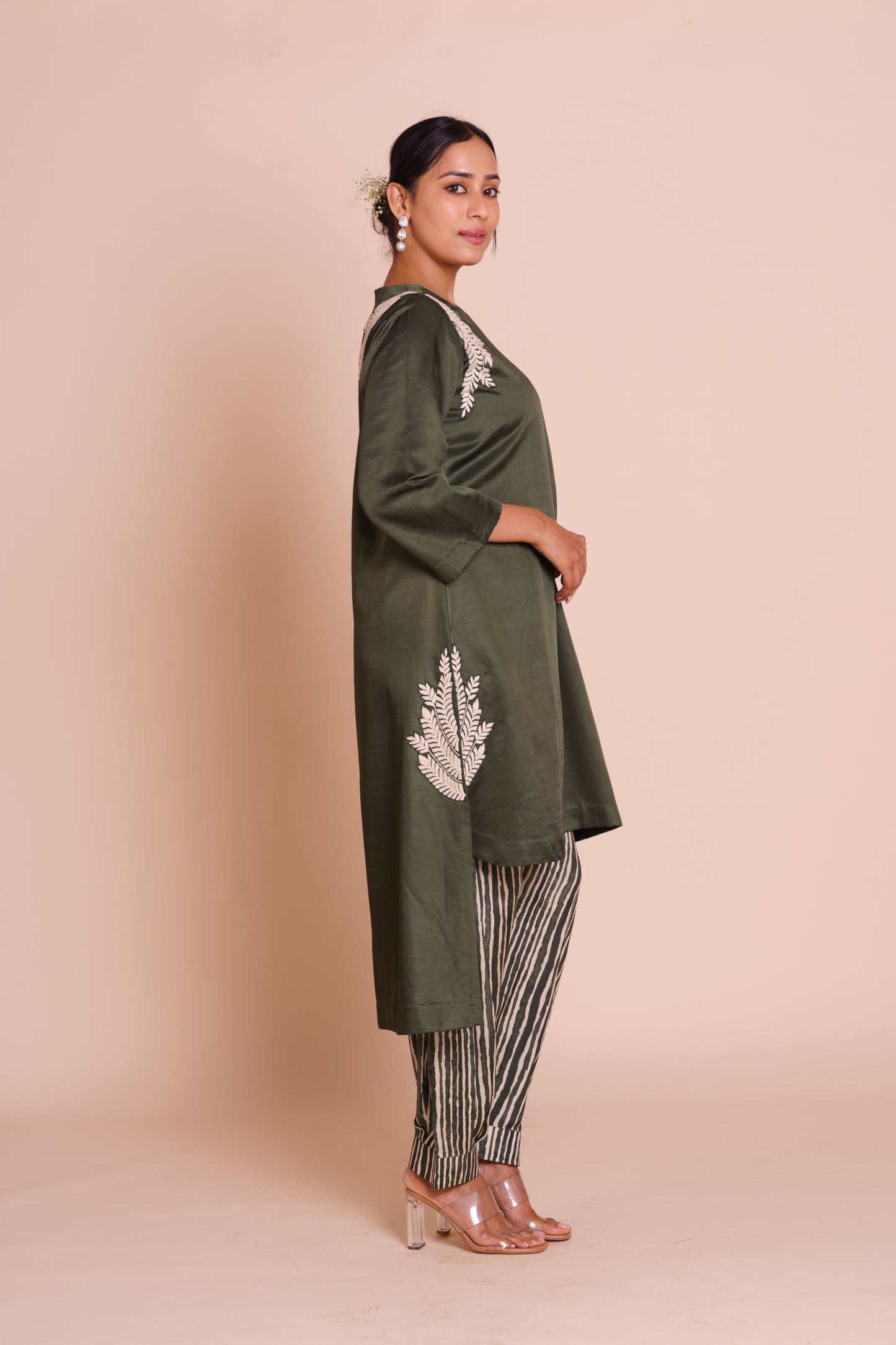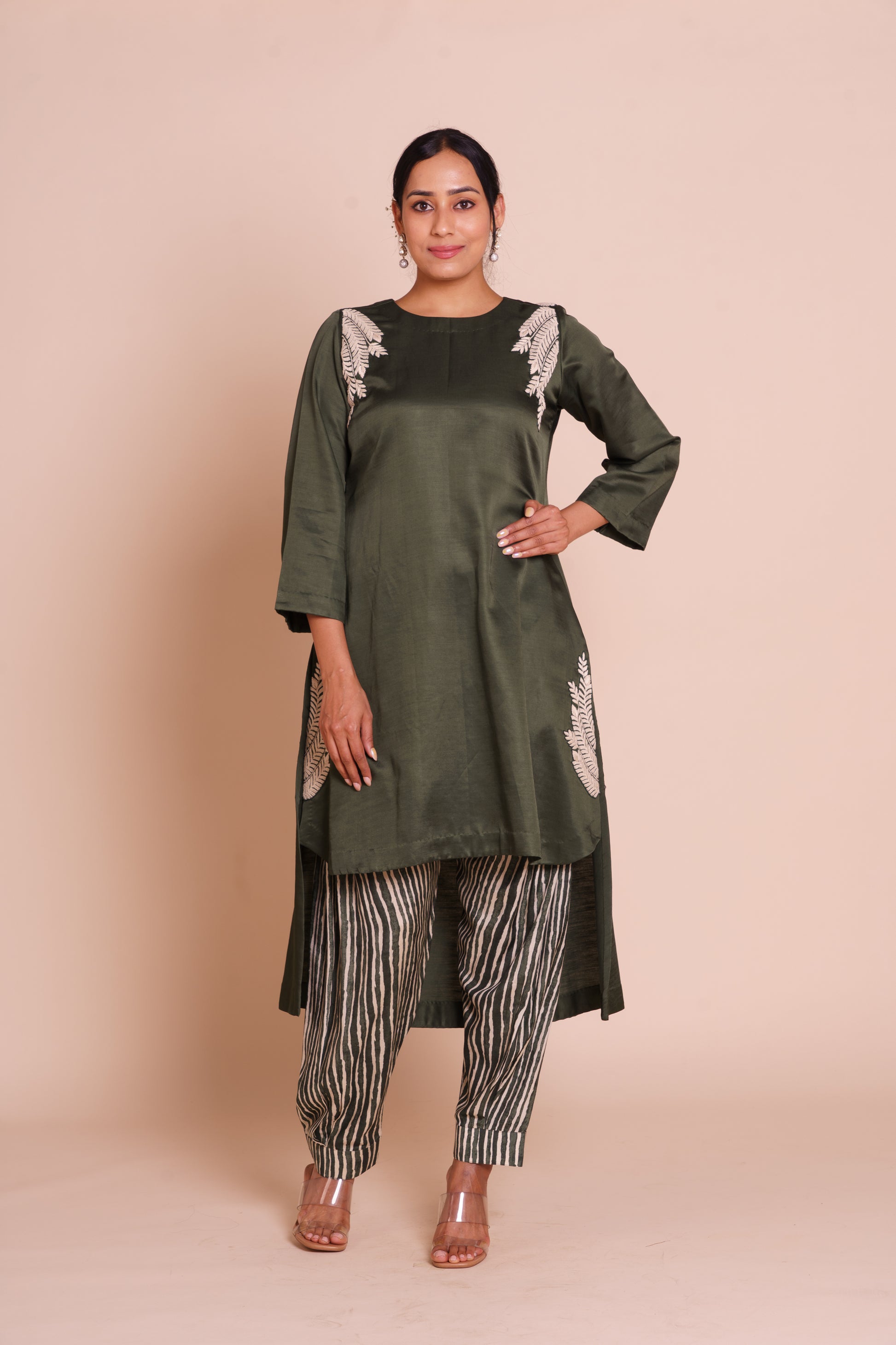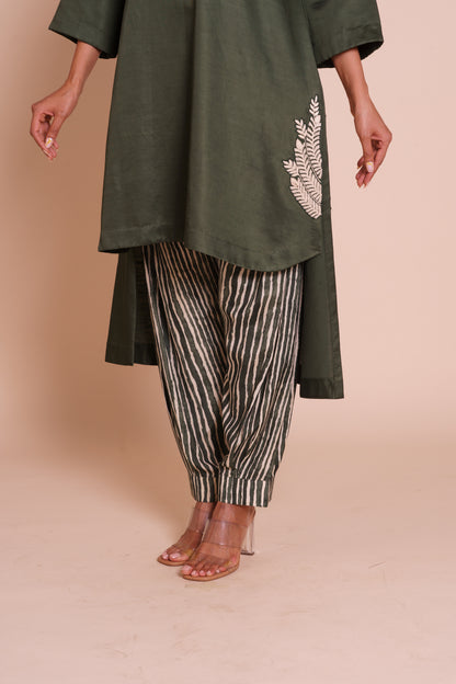 A graceful bottle green kurta set, detailed with offwhite thread hand embroidery along the neckline and sleeves. A timeless linen satin ensemble with a printed spun silk bottom.