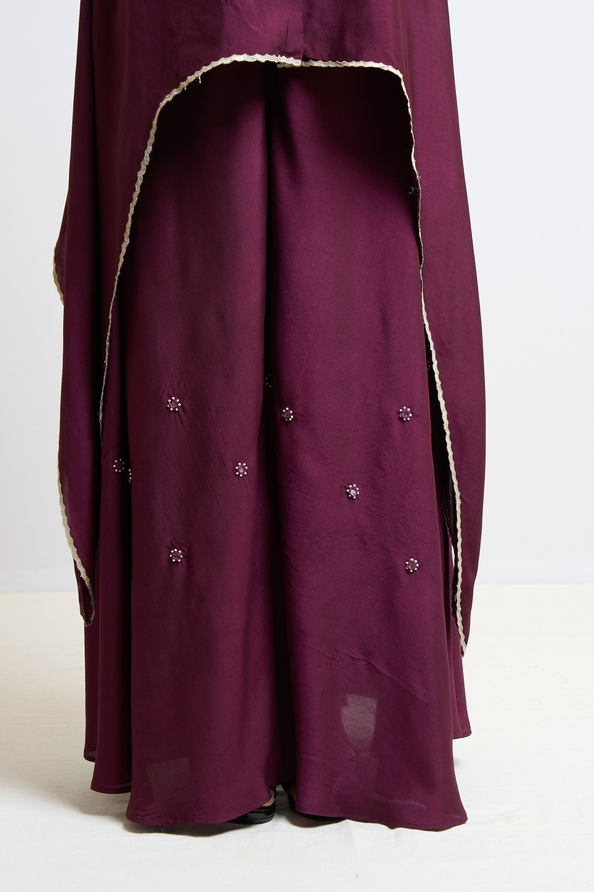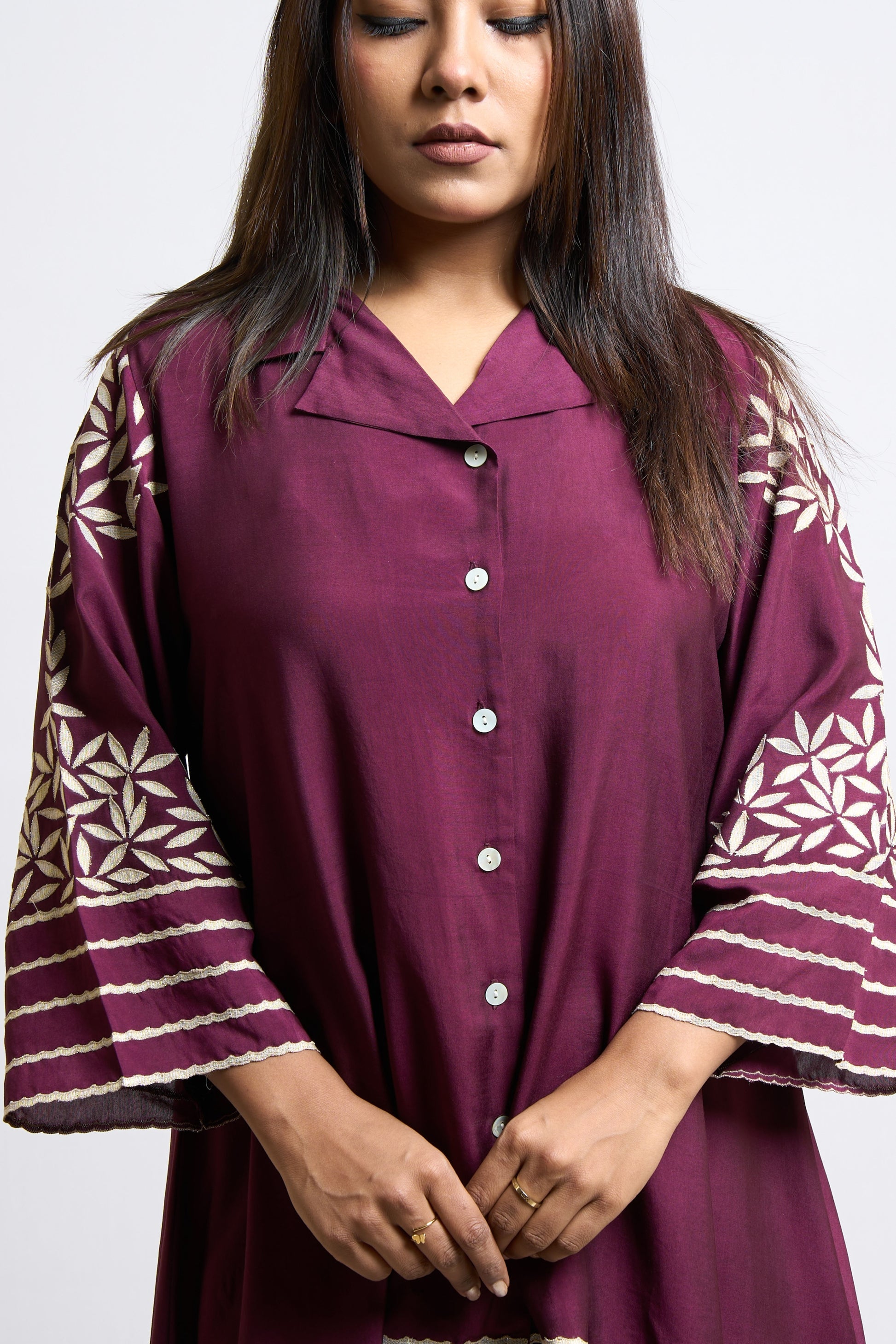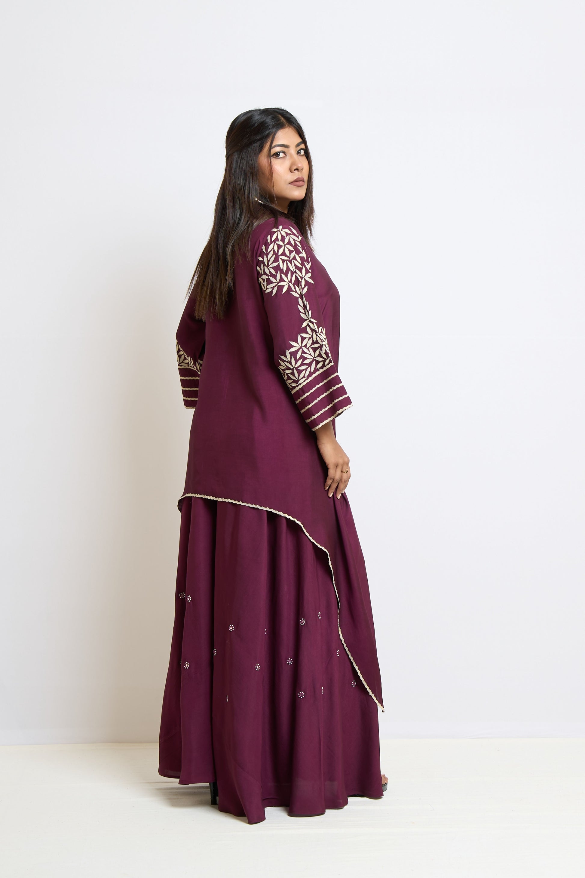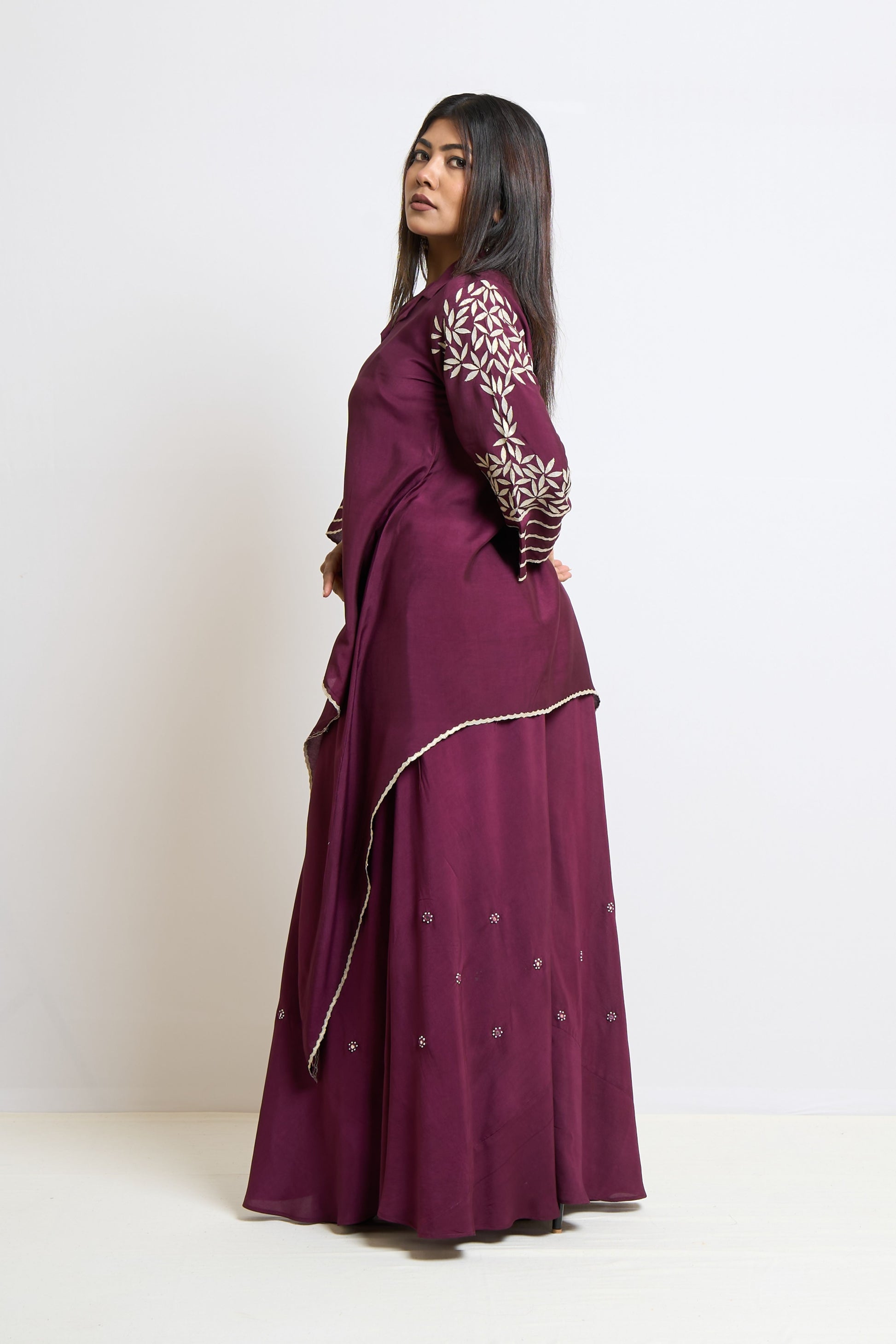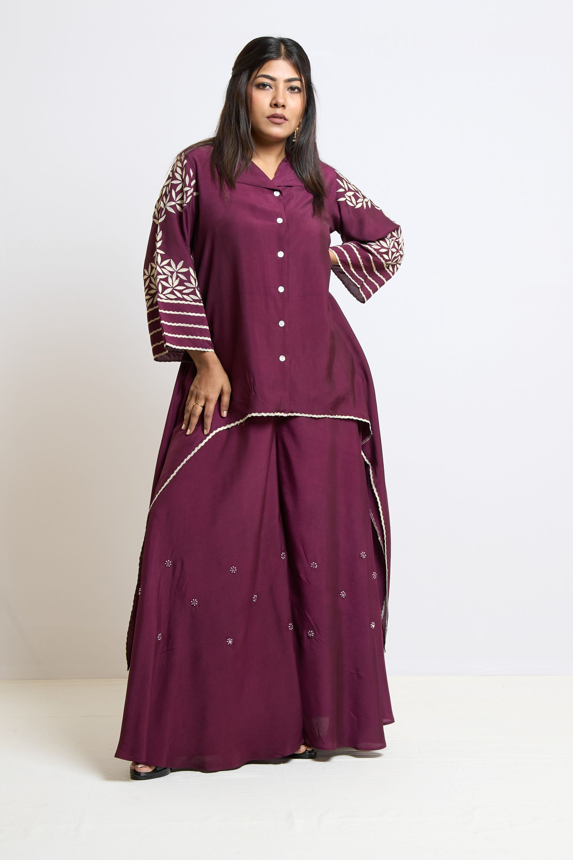 A wine spun silk co-ord, highlighted with silver tissue floral appliqué, cutwork details on sleeves and hem, and mirror-pearl embroidered butis on the pants