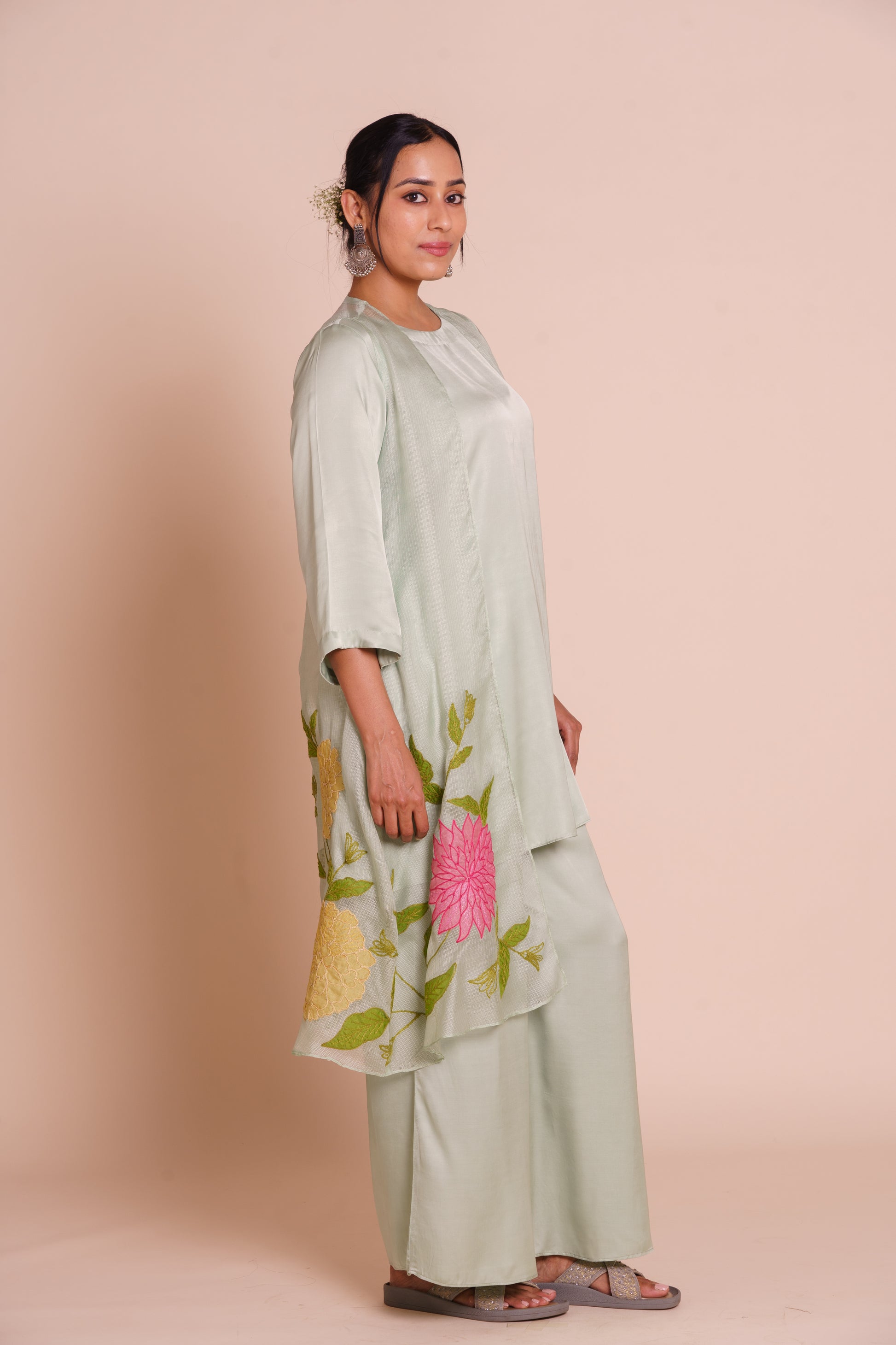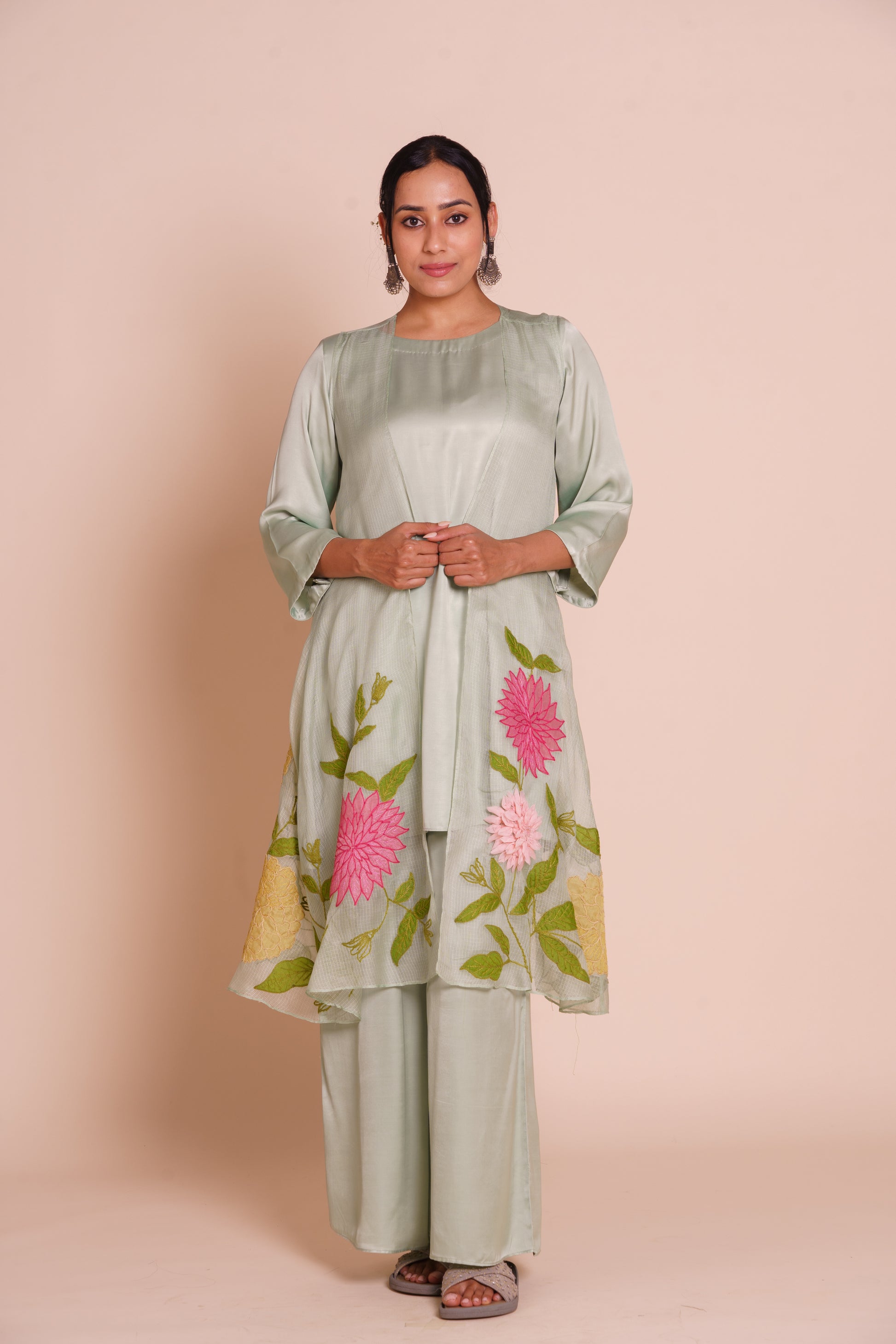 A soft pastel green kurta and jacket set, detailed with multicolour appliqué machine embroidery on the ghara. A contemporary look with artisanal detailing, crafted in modal satin with kora silk.