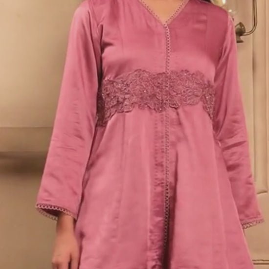 A pink linen satin kurta with self-colour organza 3d flower embroidery at the waistline, paired with matching linen satin sharara.