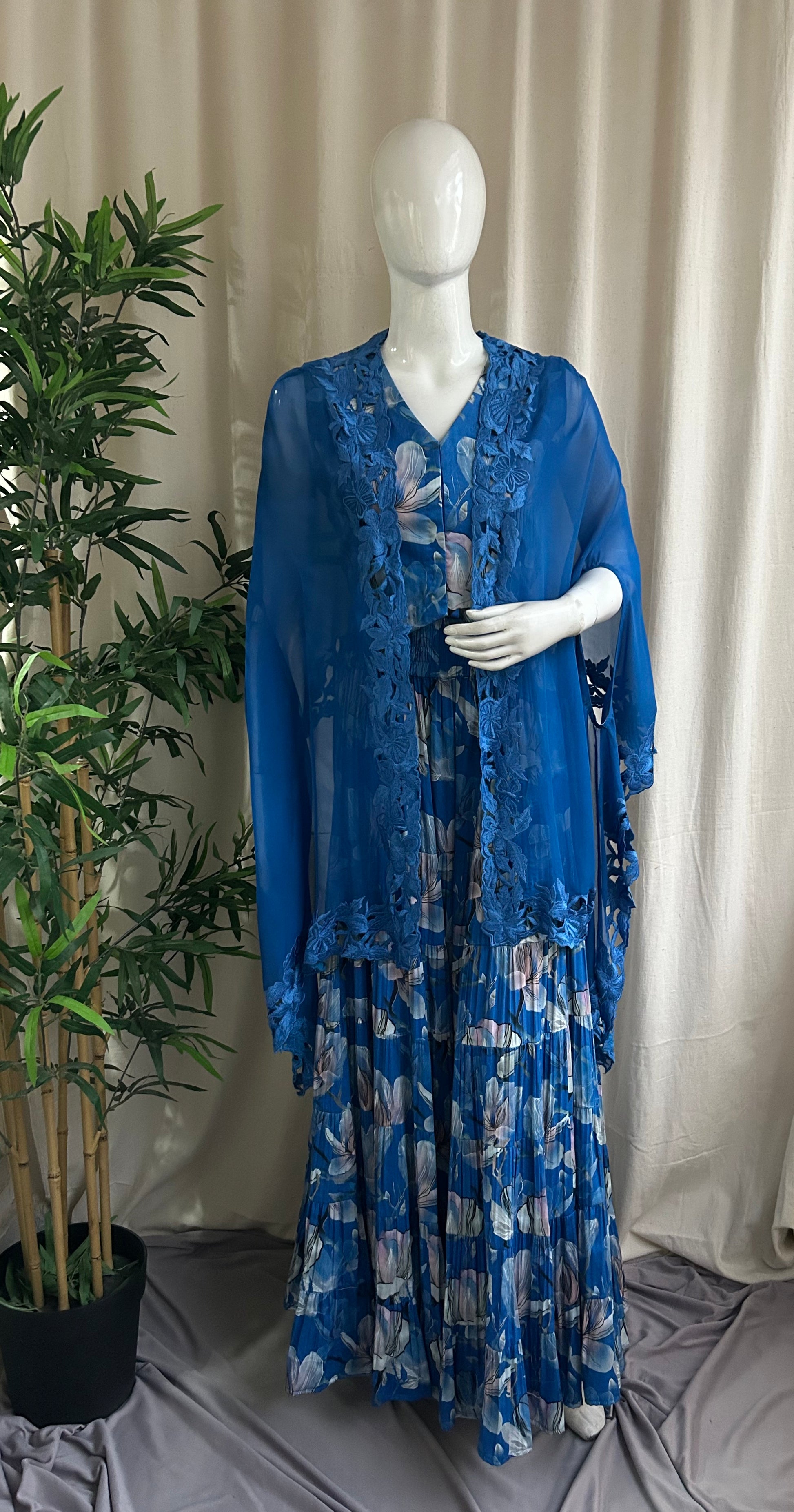 A vision in berry blue, this floral skirt embodies understated elegance. Crafted in paper organza cape with cotton satin blouse and skirt, it brings together lightness and structure for a graceful flow.