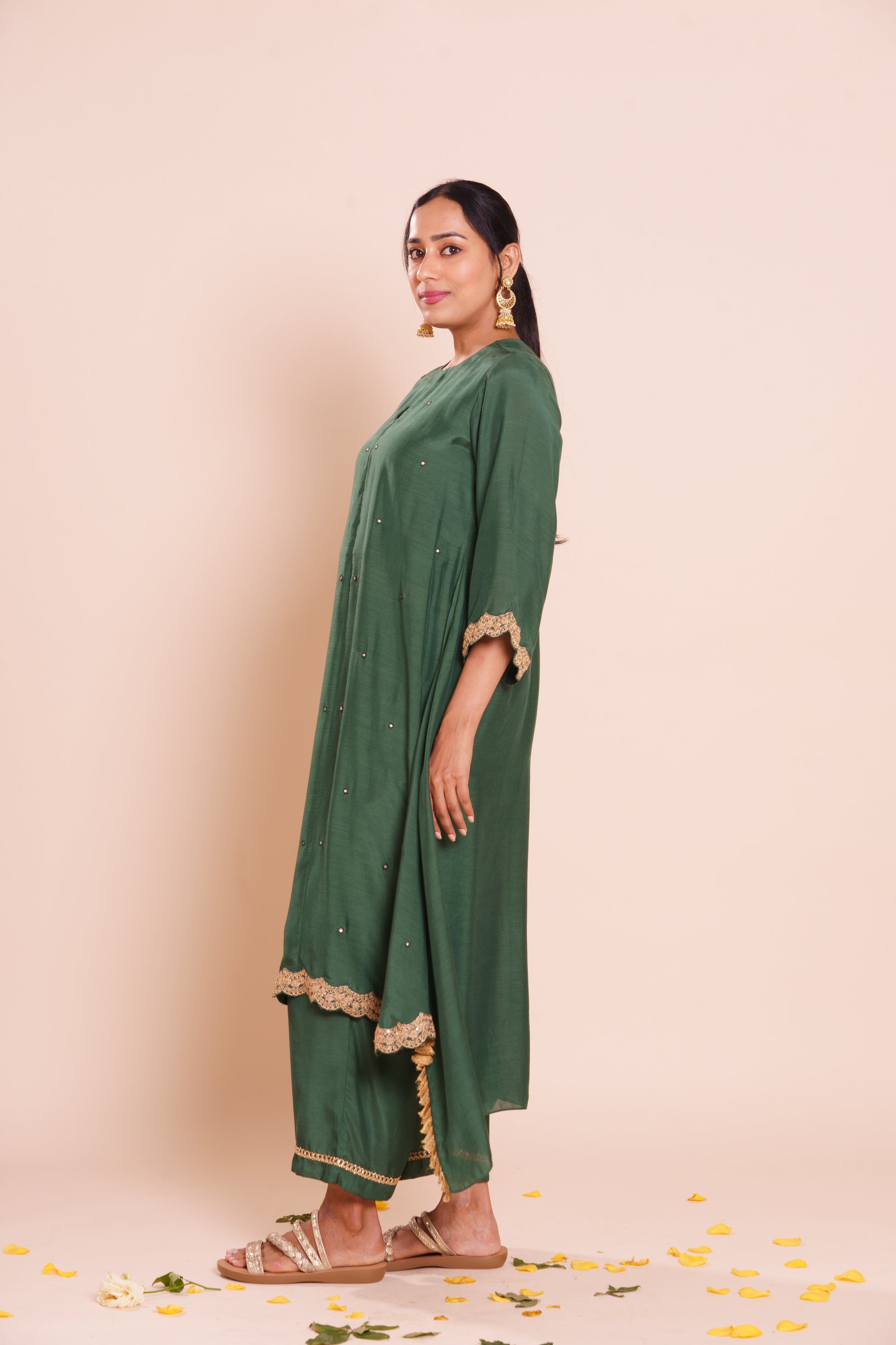A classic bottle green muslin kurta set, elevated with gold dori hand embroidery on the sleeves and hemline. A rich yet understated choice for versatile wea