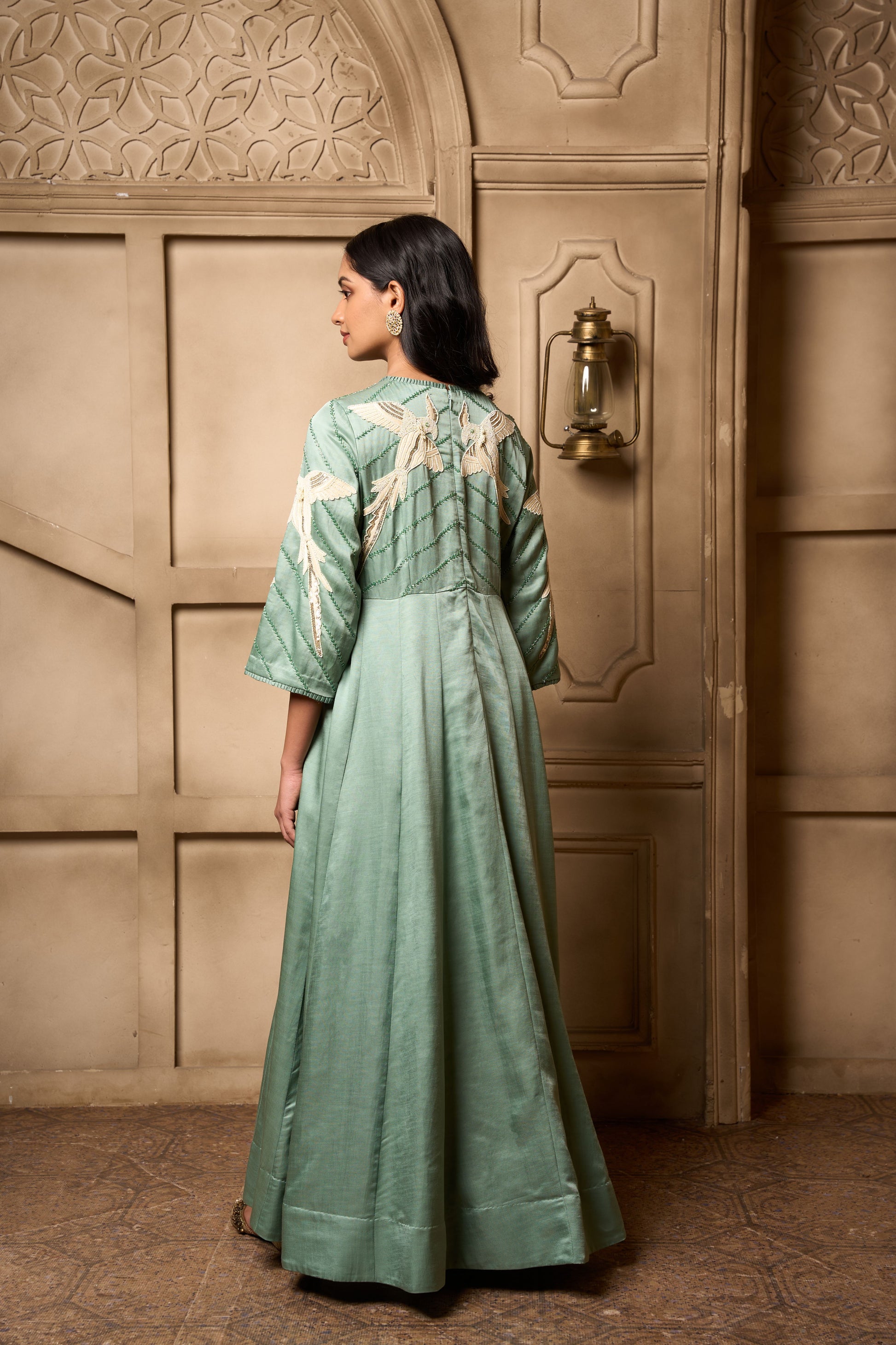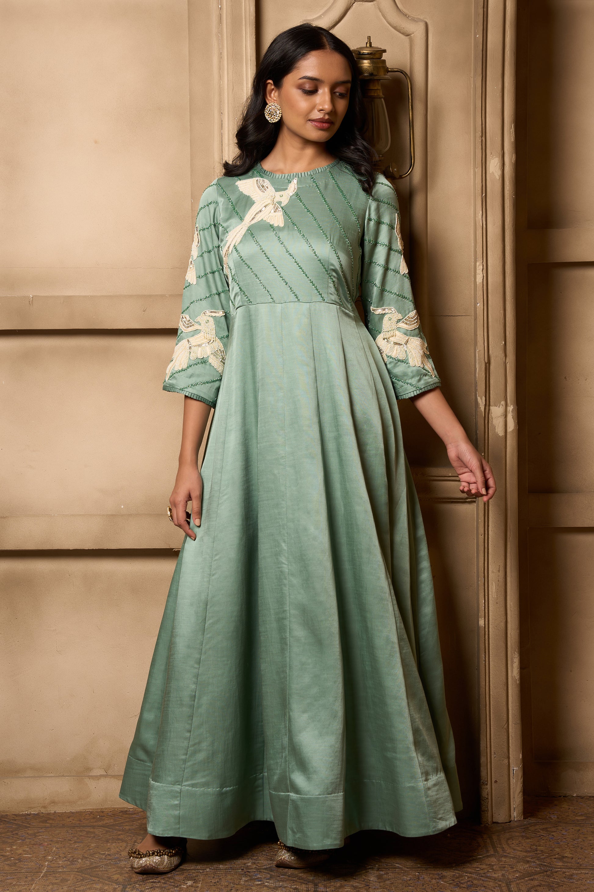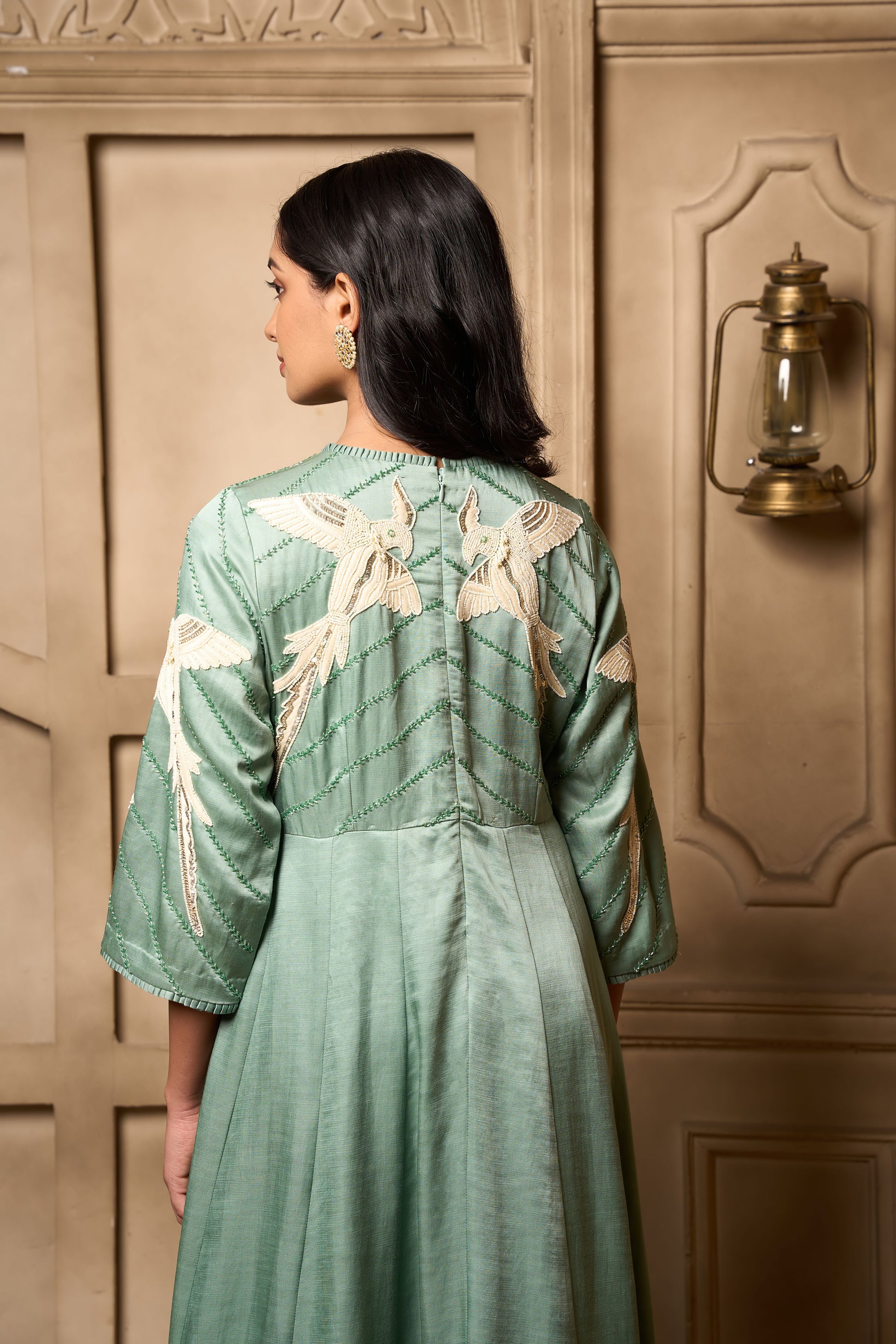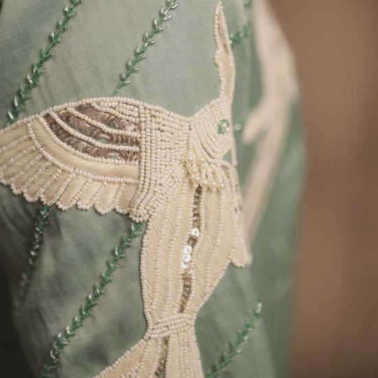 A sage green linen satin kalidar with self kardana and white bead hand embroidery on yoke front and back