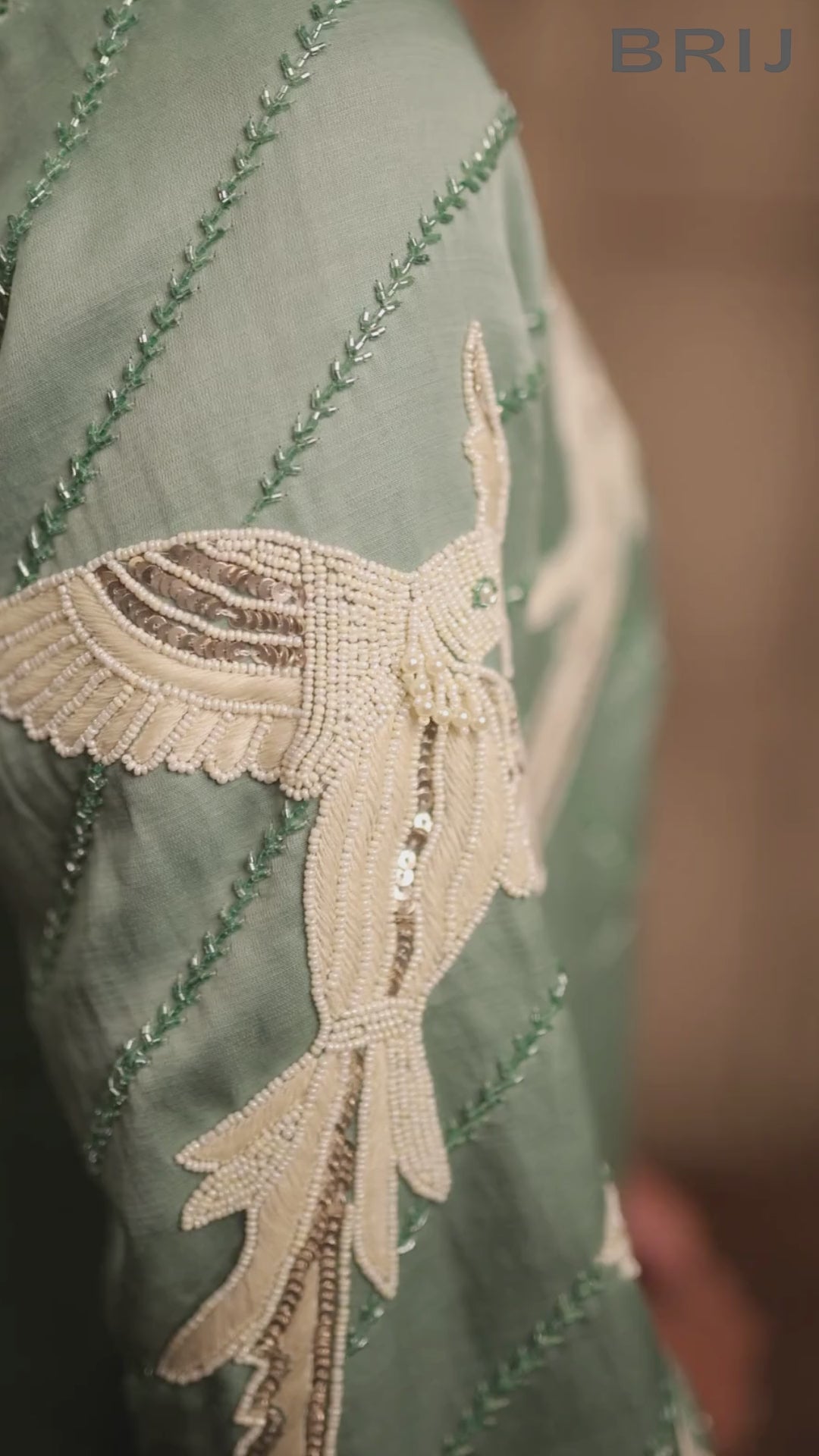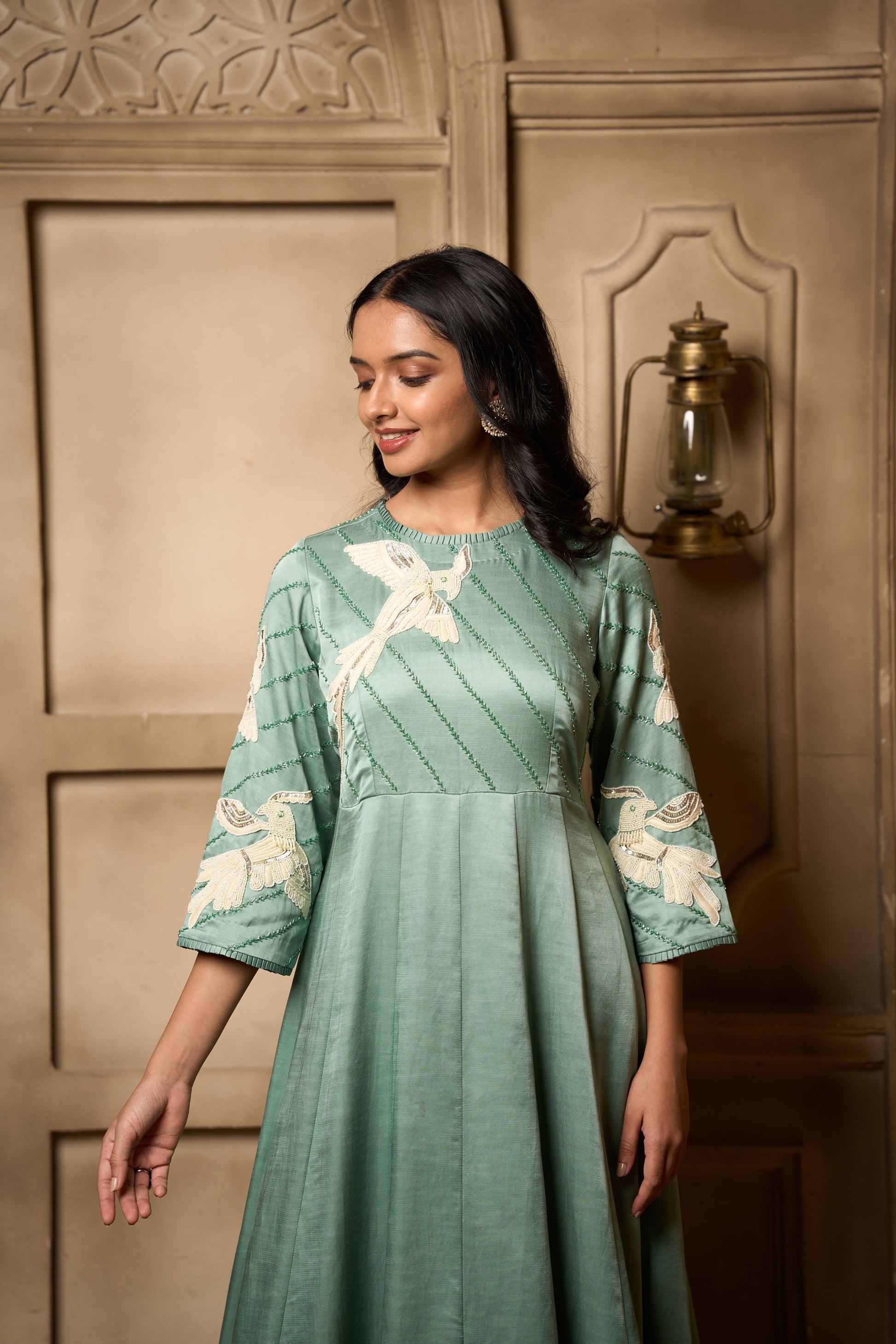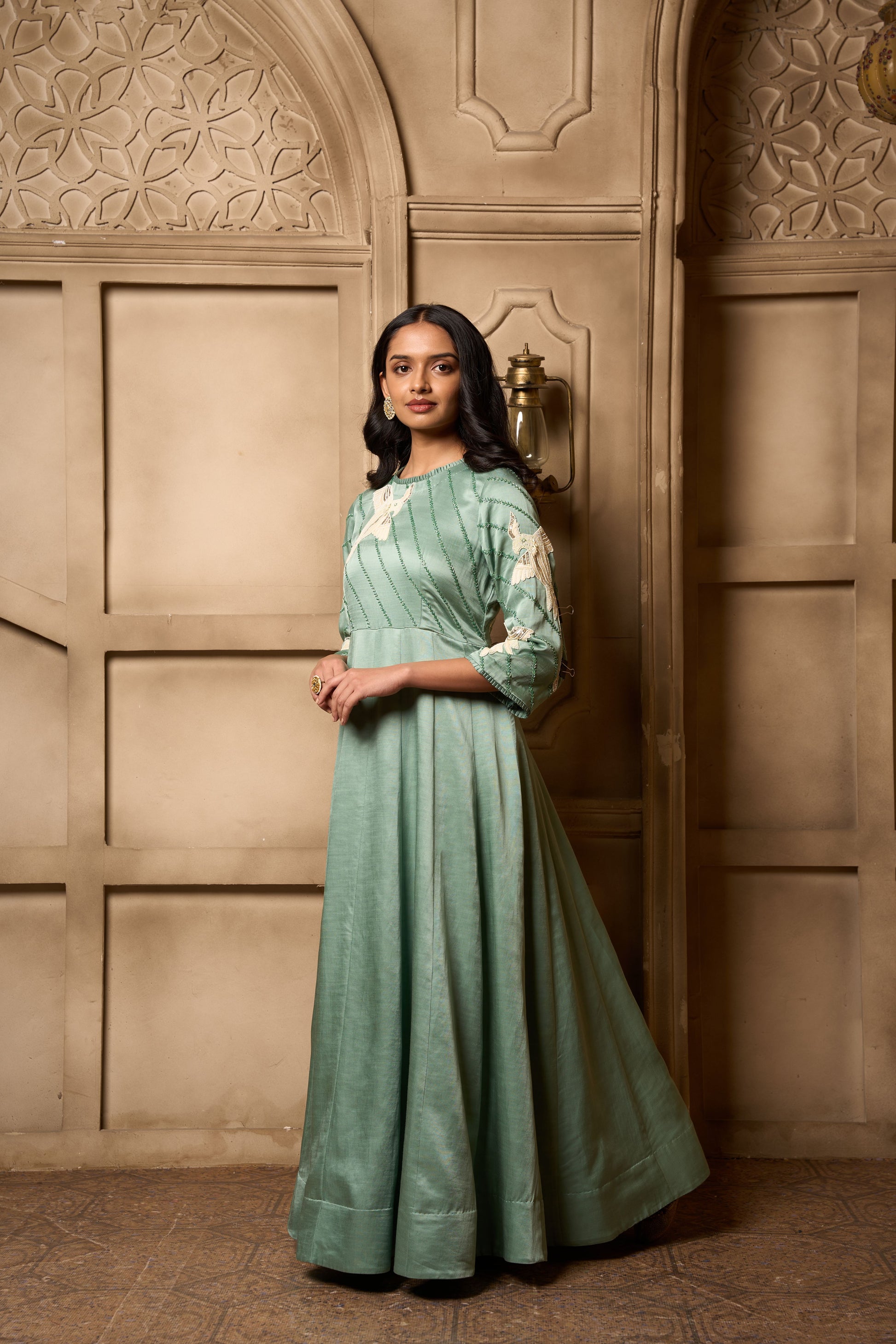 A sage green linen satin kalidar with self kardana and white bead hand embroidery on yoke front and back