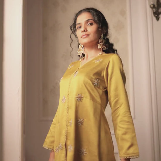 A mustard yellow linen satin kurta with silver zardozi hand embroidered butas, paired with linen satin sharara