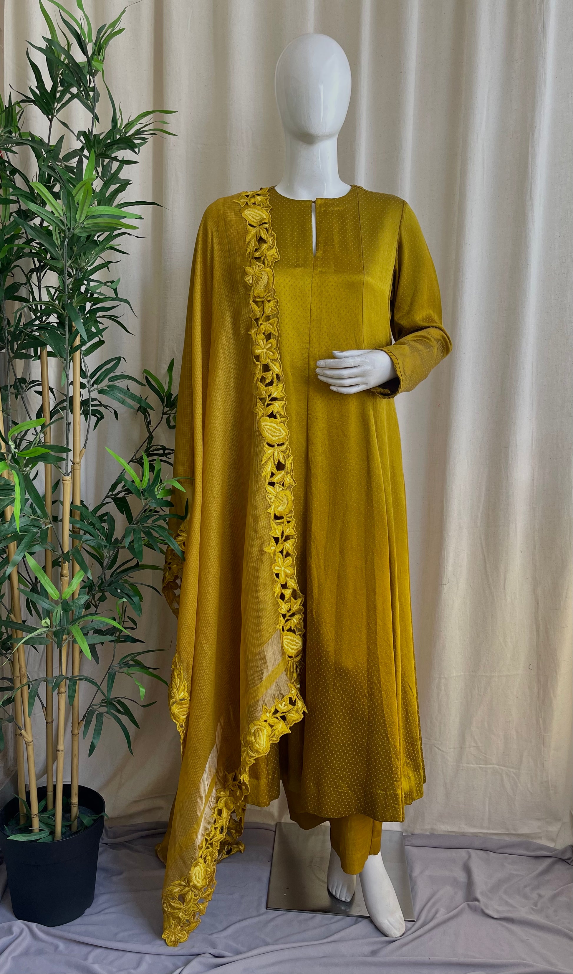 Inspired by Bhanu, this mustard mashru silk kurta set brings warmth and richness to festive wear. Paired with a paper silk dupatta, it is ideal for celebratory occasions and statement day dressing.