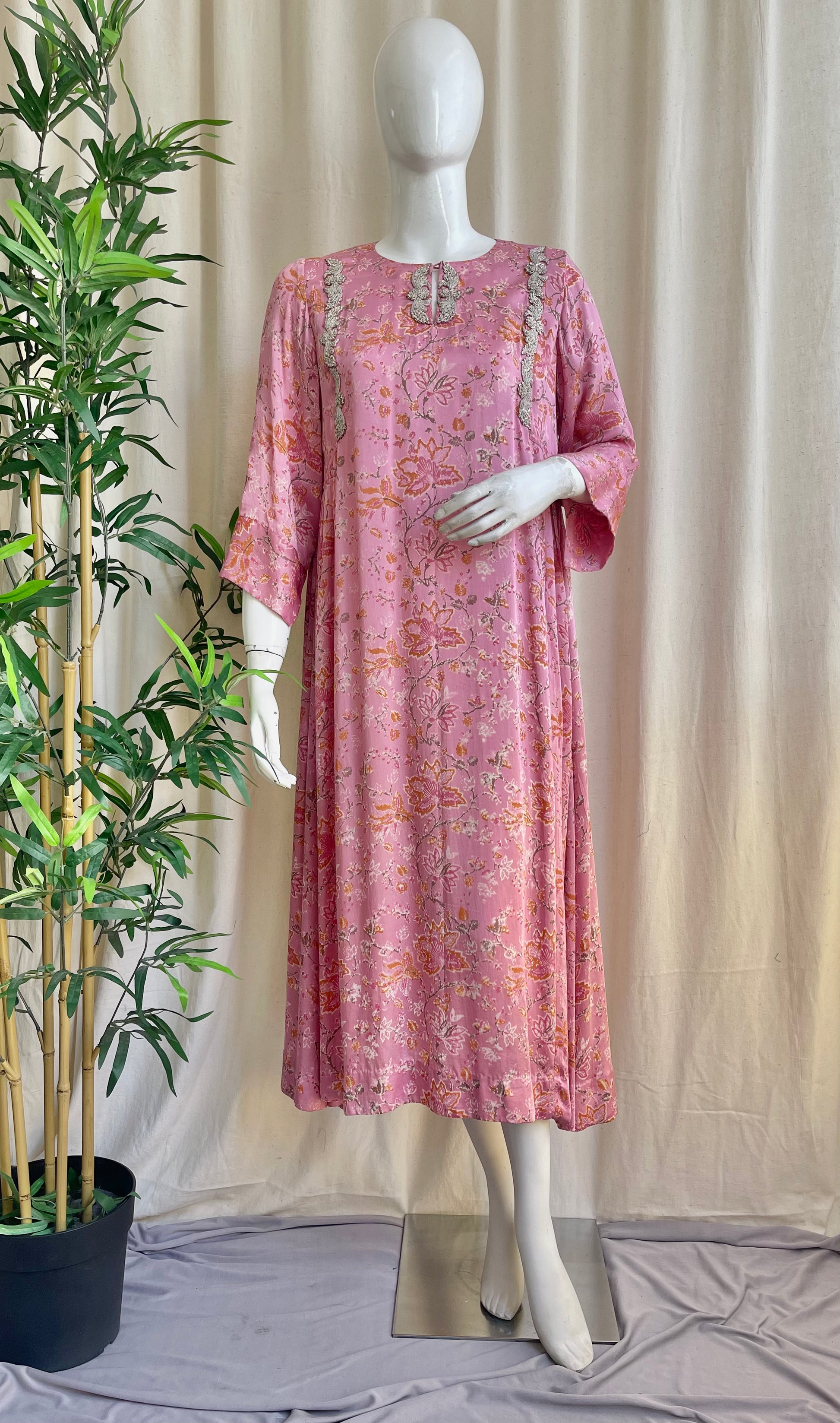 Like Raatrani blooming at dusk, this pink ajrak dress carries quiet depth and softness. Crafted in modal satin with dori hand embroidery, it drapes fluidly — a gentle statement for intimate festive evenings.
