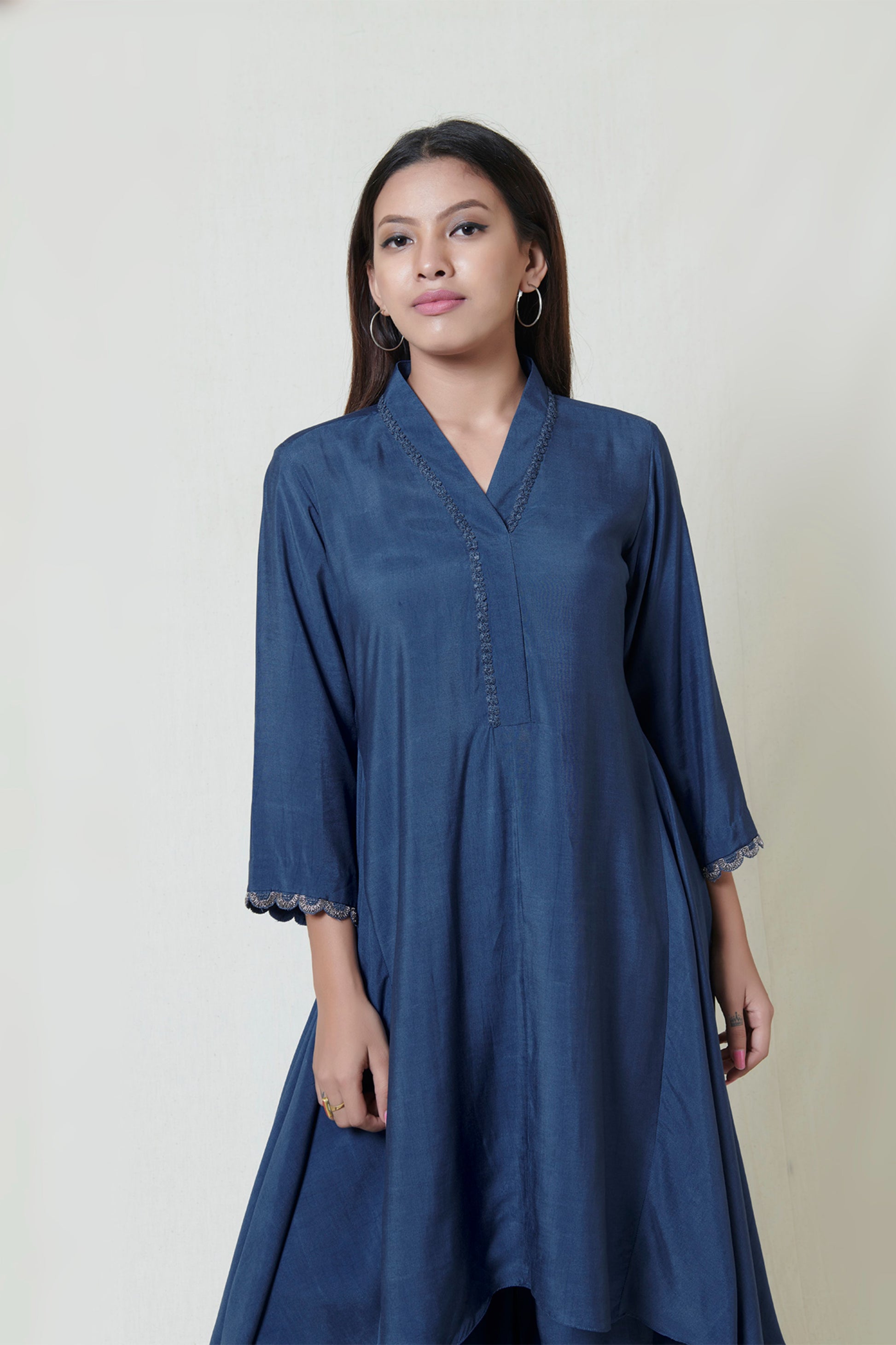 Hand thread embroidery on kurta neckline. Zardozi faresha embroidery detail on sleeve hemline. Asymmetrical hemline drape pants. Grey kanchi tissue applique and cutwork detail on pant hemline