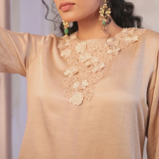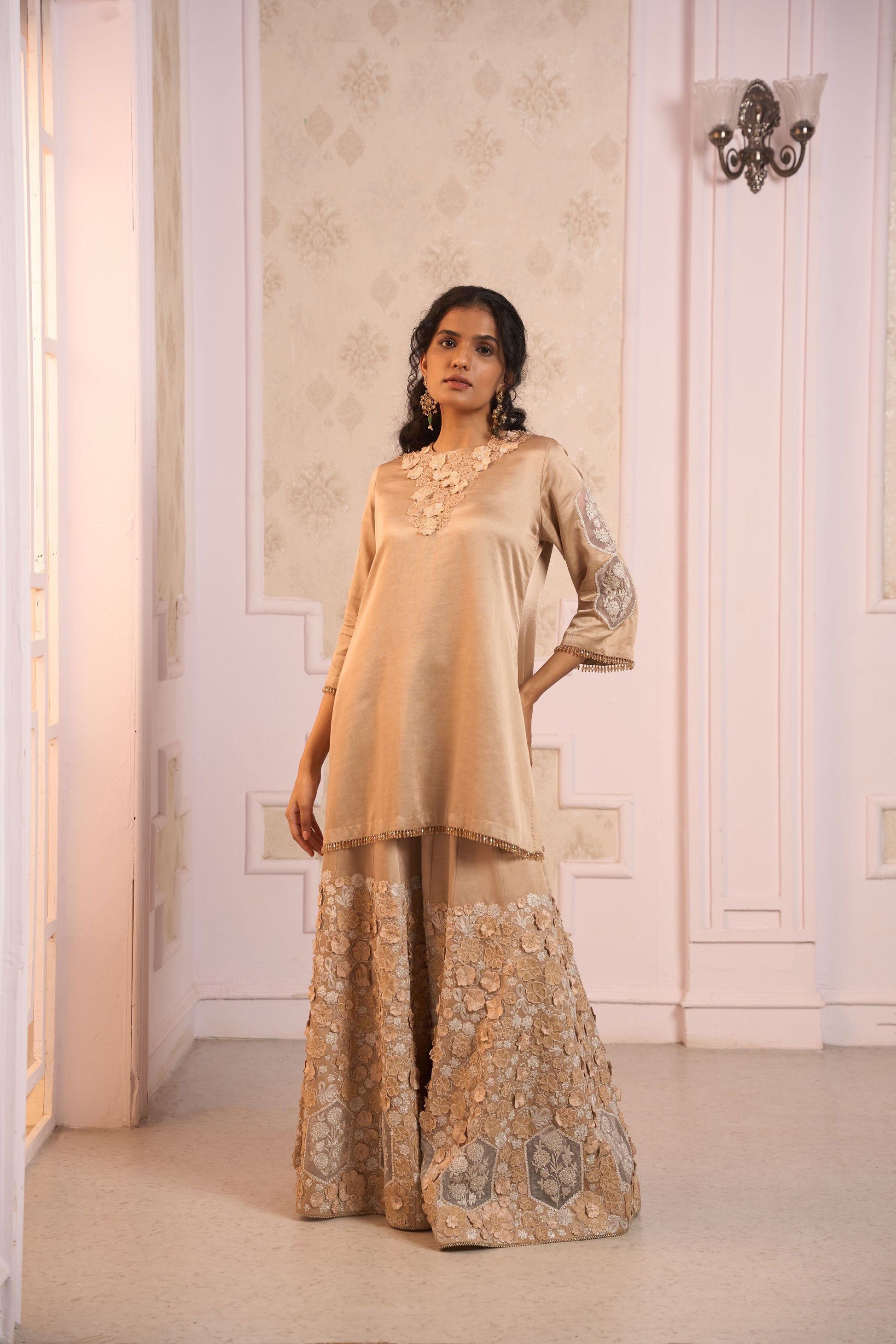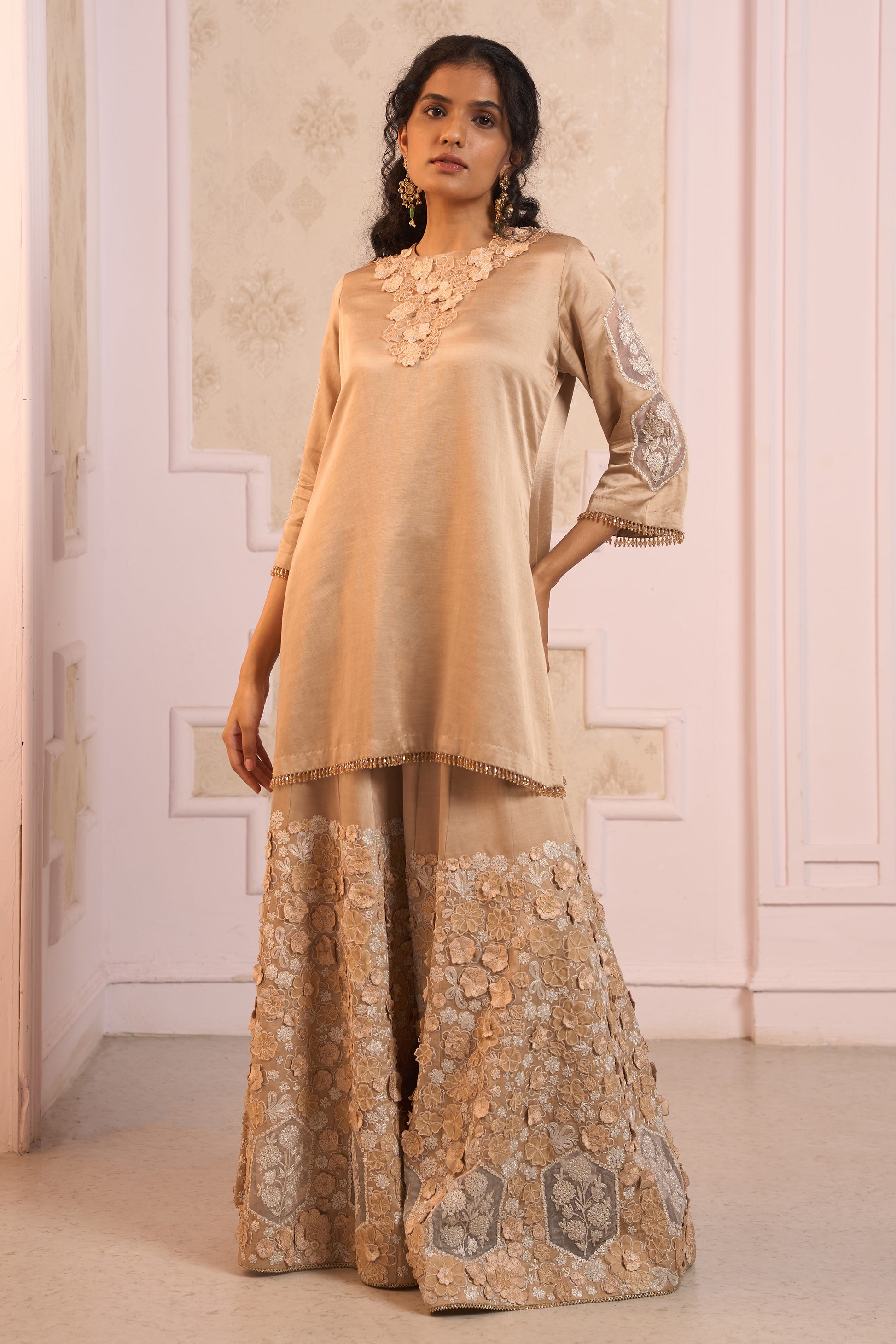 A beige linen satin short kurta with silver dori and self-thread 3d floral machine embroidery, styled with matching linen satin sharara.