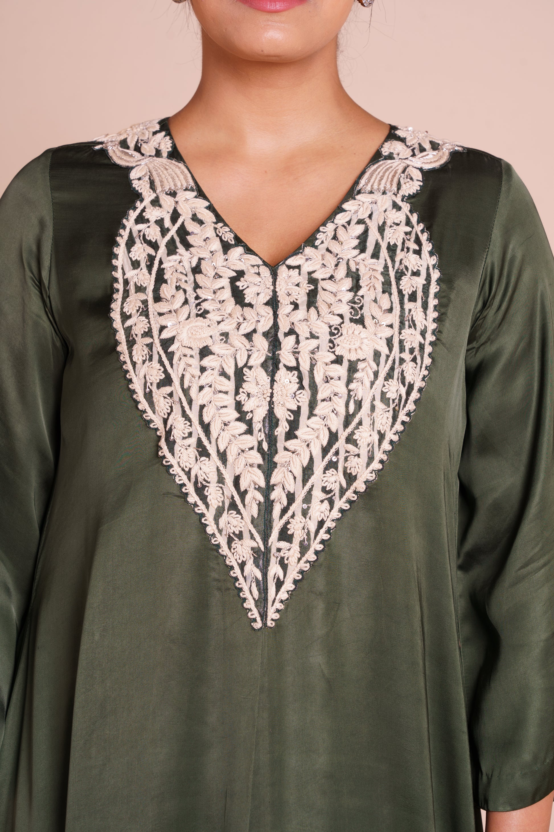 A sophisticated bottle green kurta set, featuring off white thread and zardozi hand embroidery on the neckline. Crafted in modal satin with a printed spun silk bottom for timeless elegance
