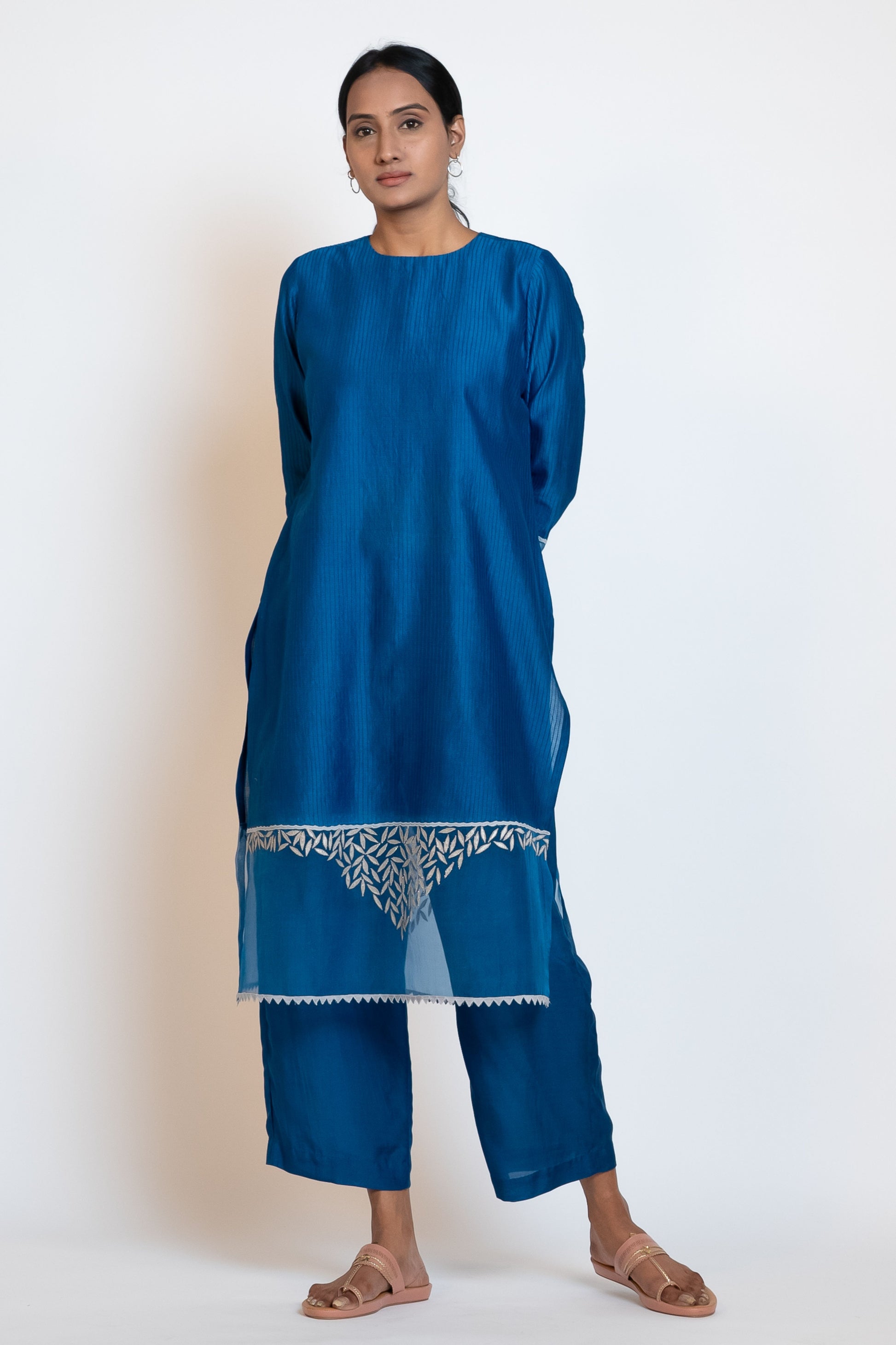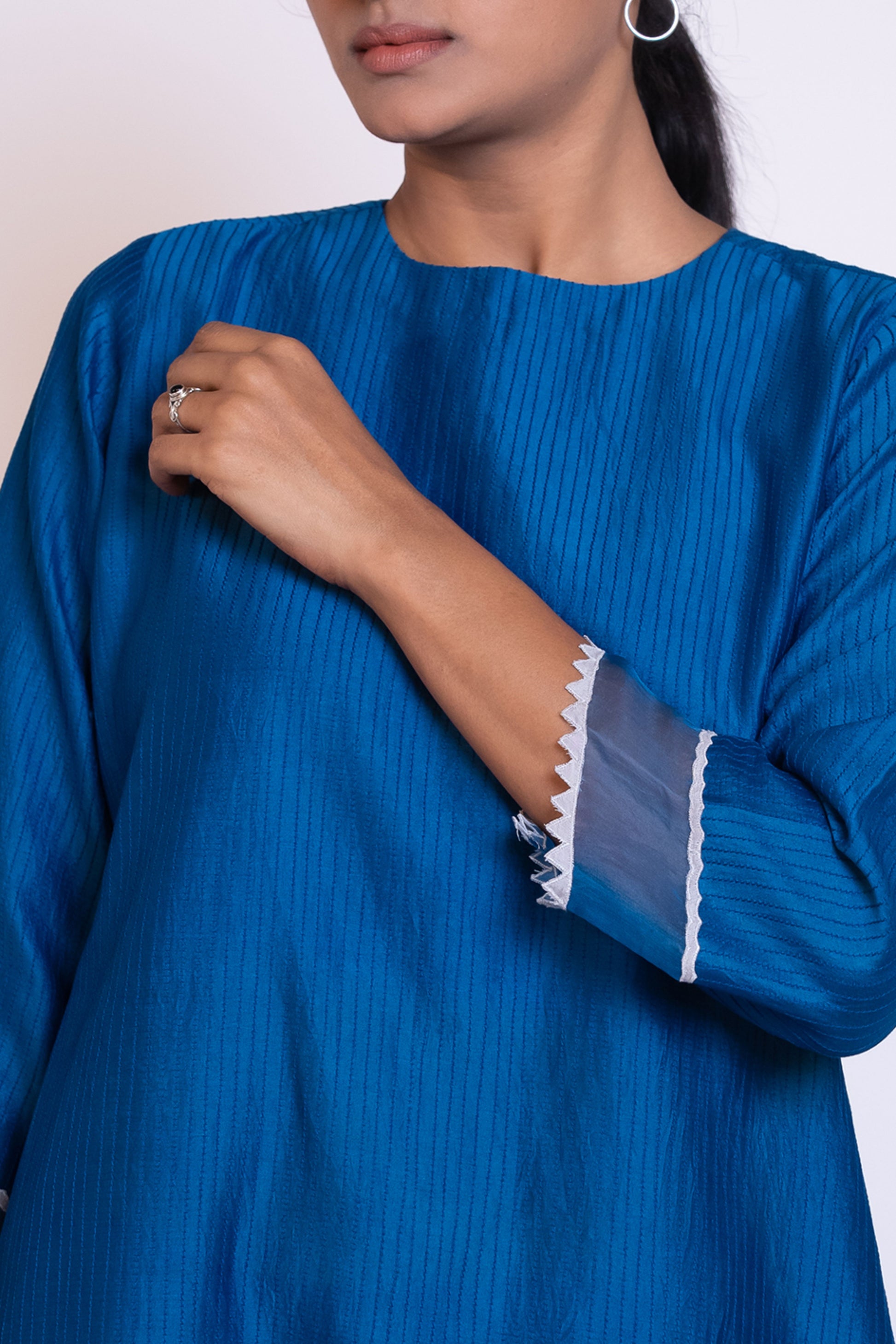An electric blue chanderi silk dagai kurta with silver tissue appliqué on organza ghara and sleeve hems.