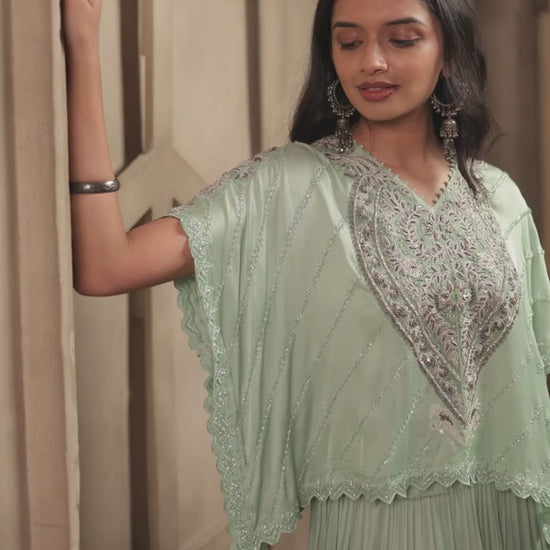 A powder blue modal satin kaftan featuring antique gold and silver zardozi with sequins, paired with a matching modal satin skirt.