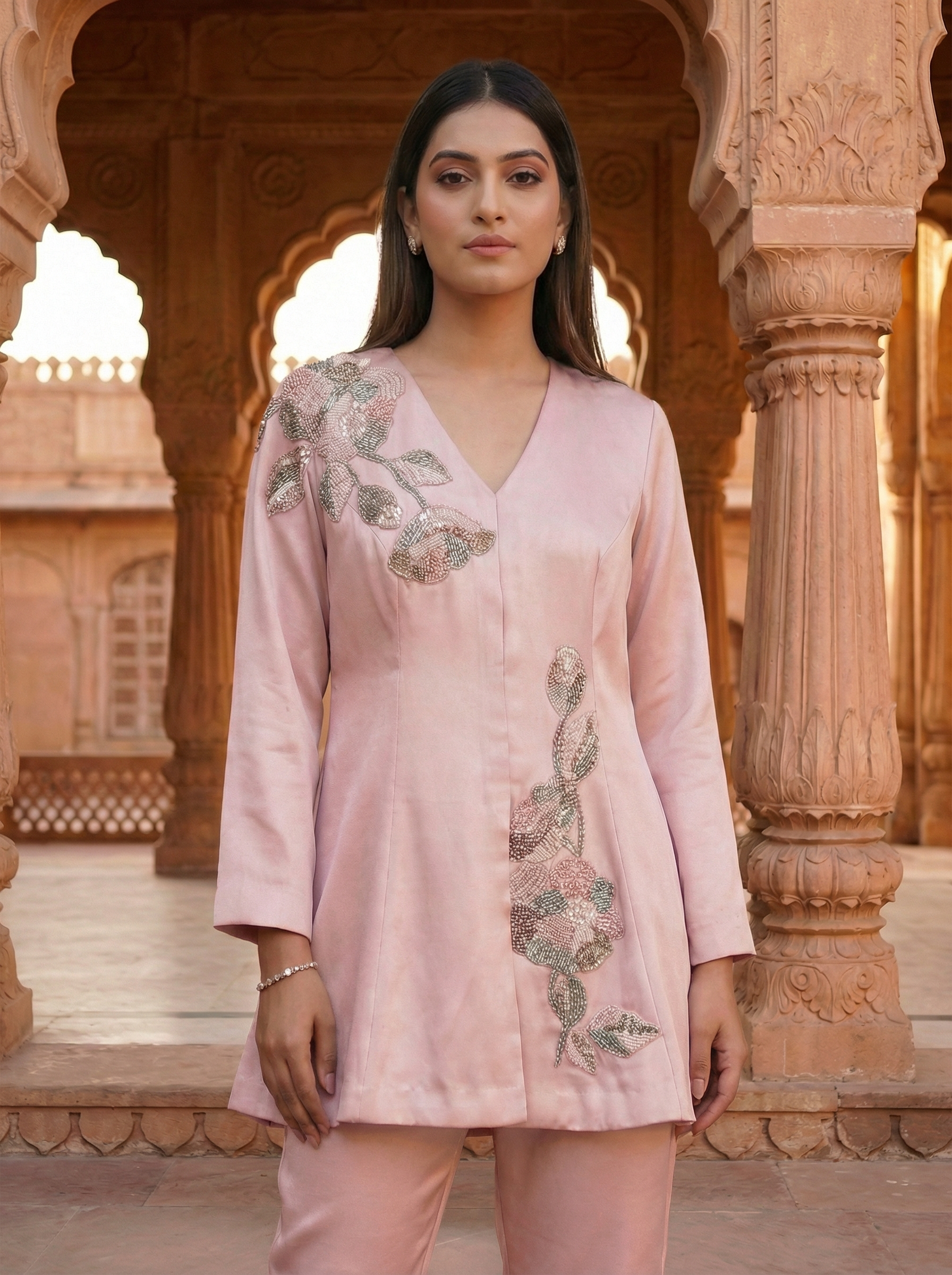 A blush pink jacket and bottom set adorned with intricate silver plus pink floral hand embroidery. Designed in Milano satin, this ensemble is bold, refined, and statement-worthy.