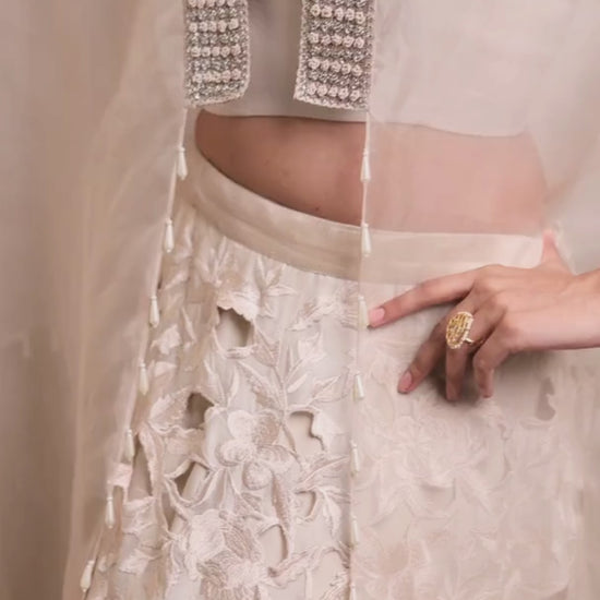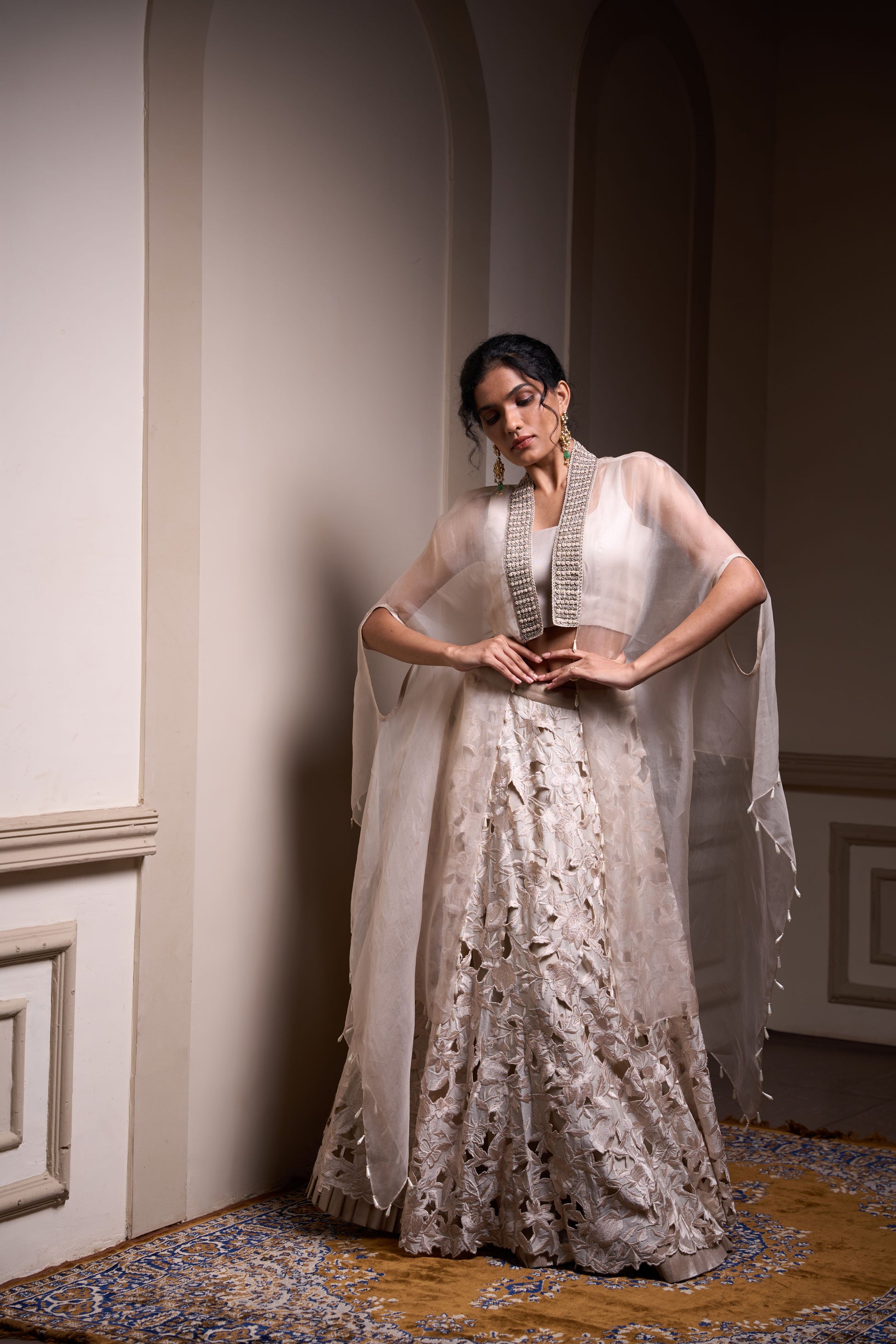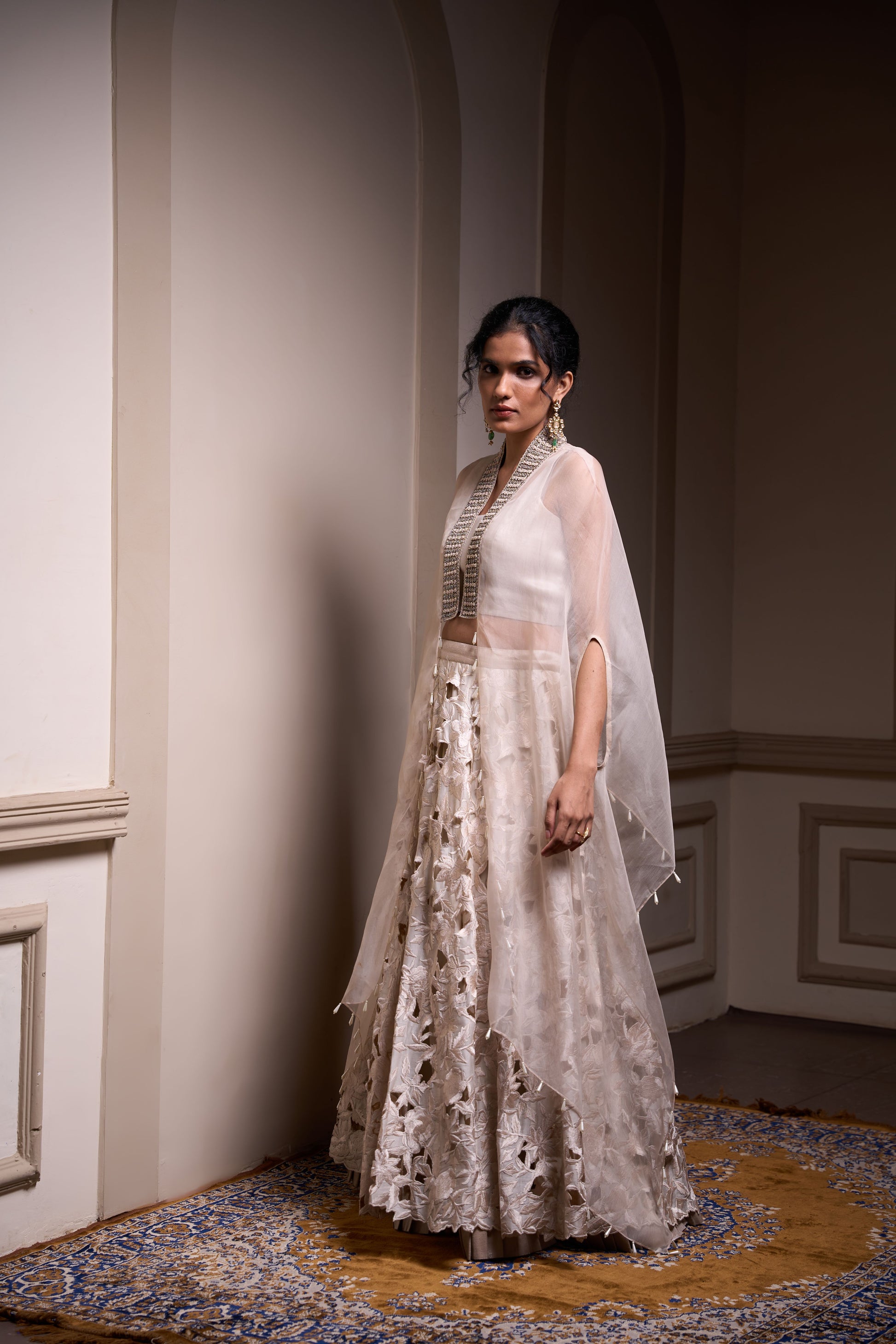 An Ivory chanderi silk skirt with all-over cutwork embroidery, paired with a kanchi tissue blouse and an organza cape with hand-embroidered borders.