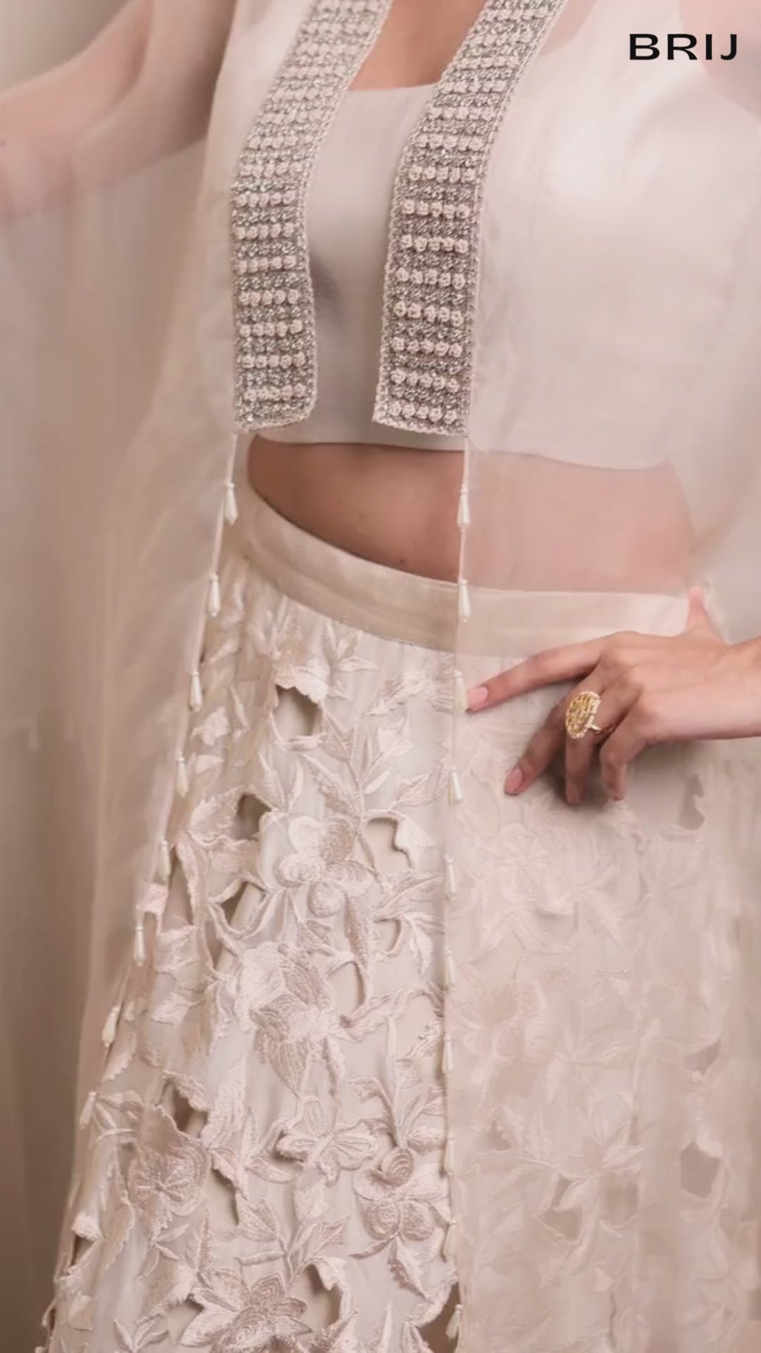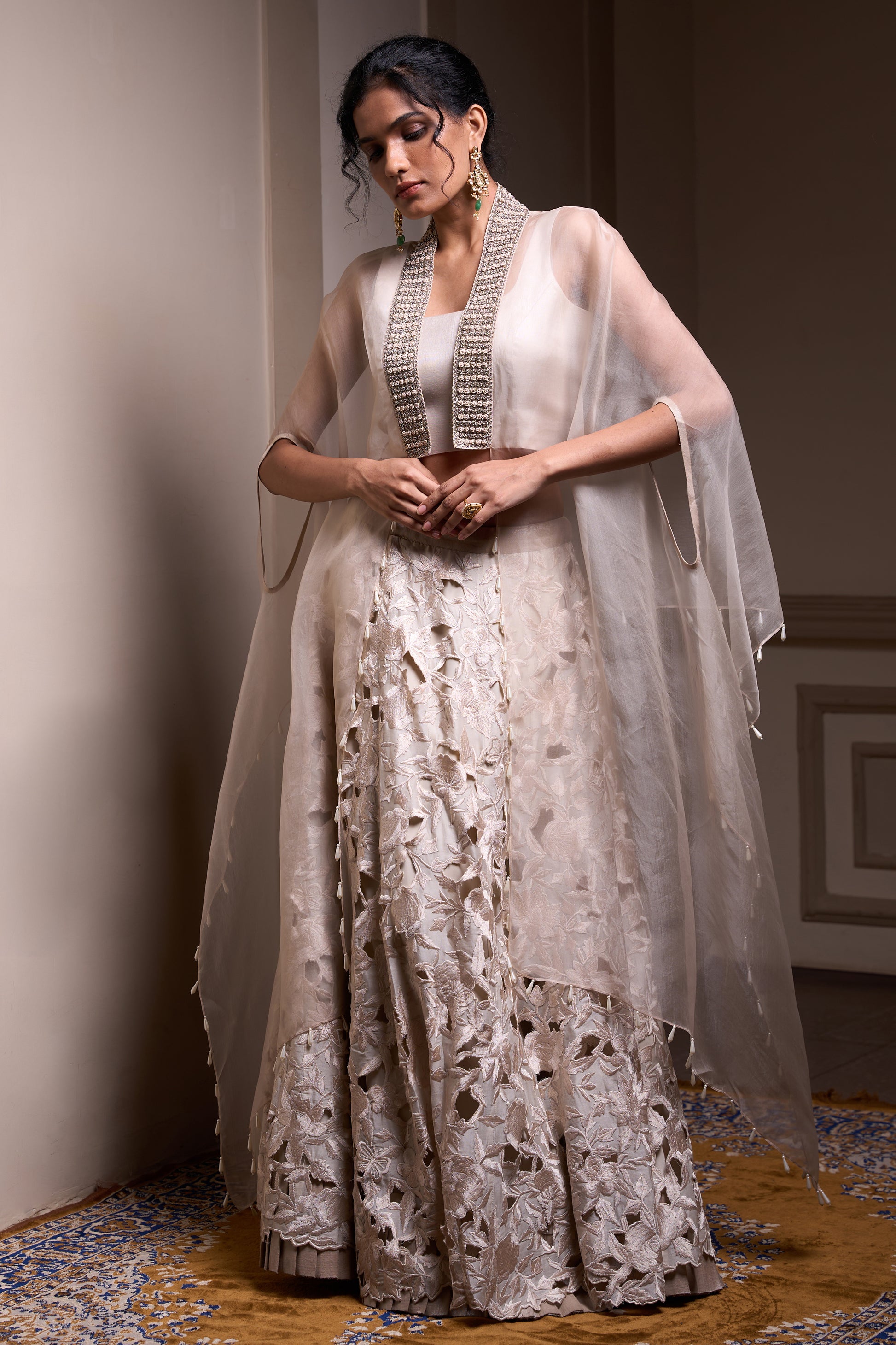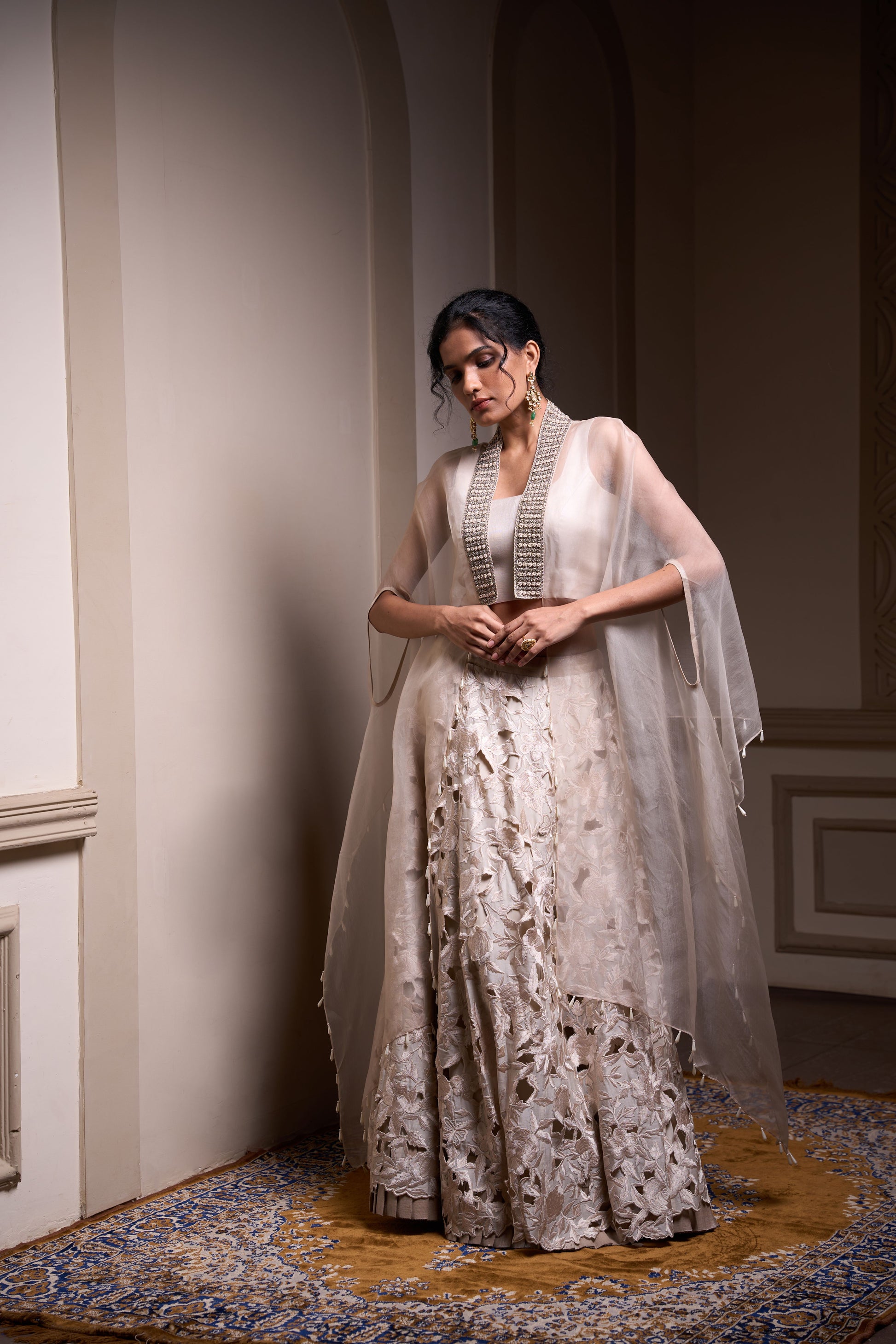 An Ivory chanderi silk skirt with all-over cutwork embroidery, paired with a kanchi tissue blouse and an organza cape with hand-embroidered borders.