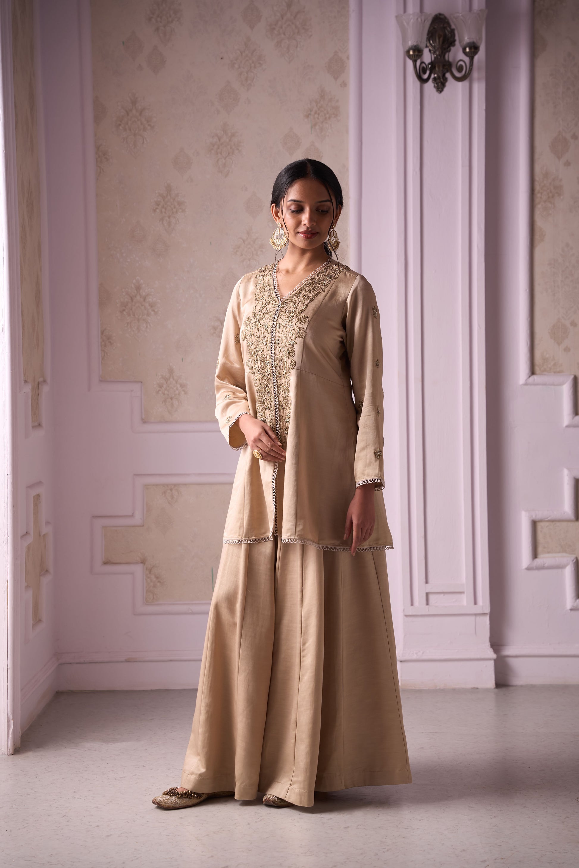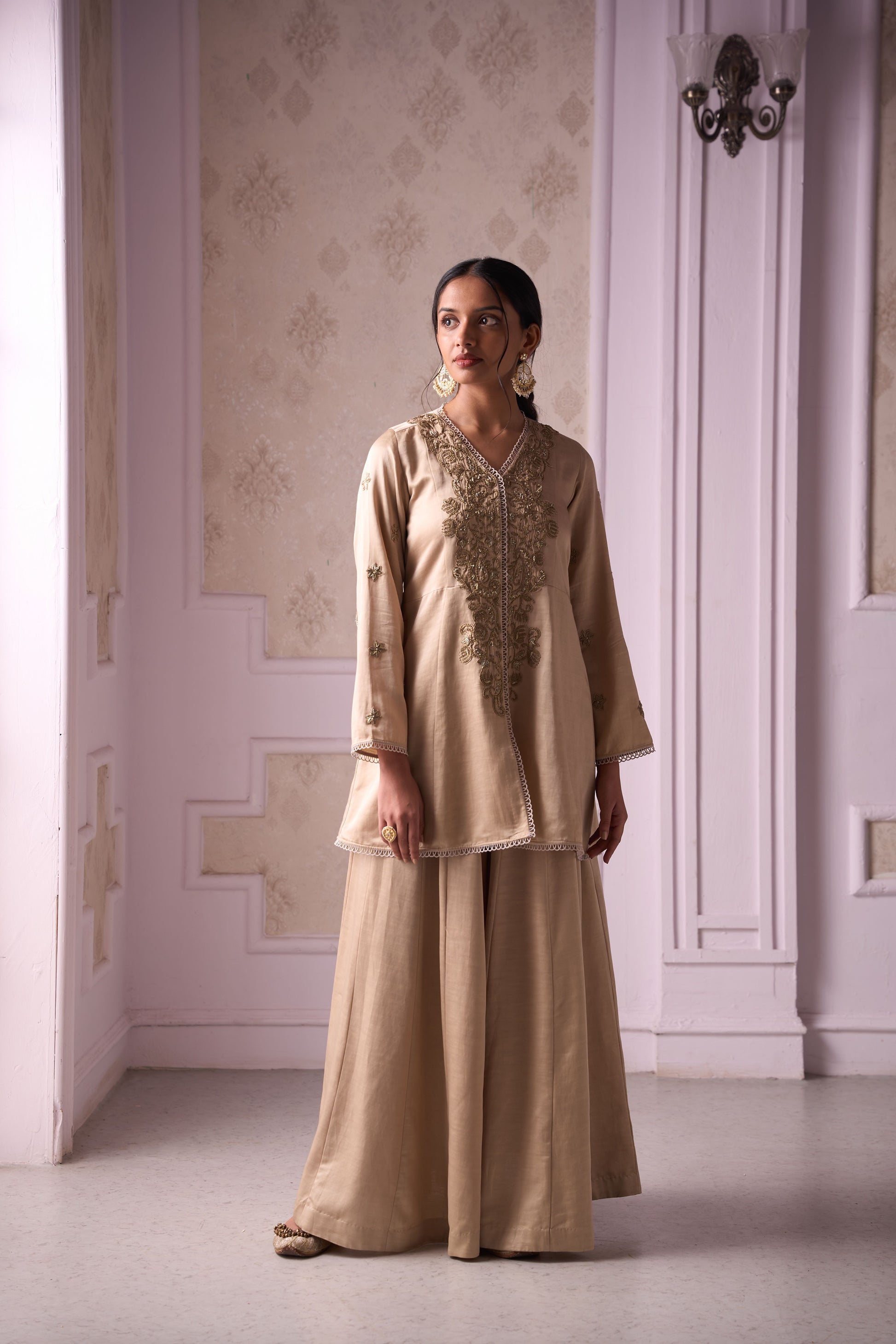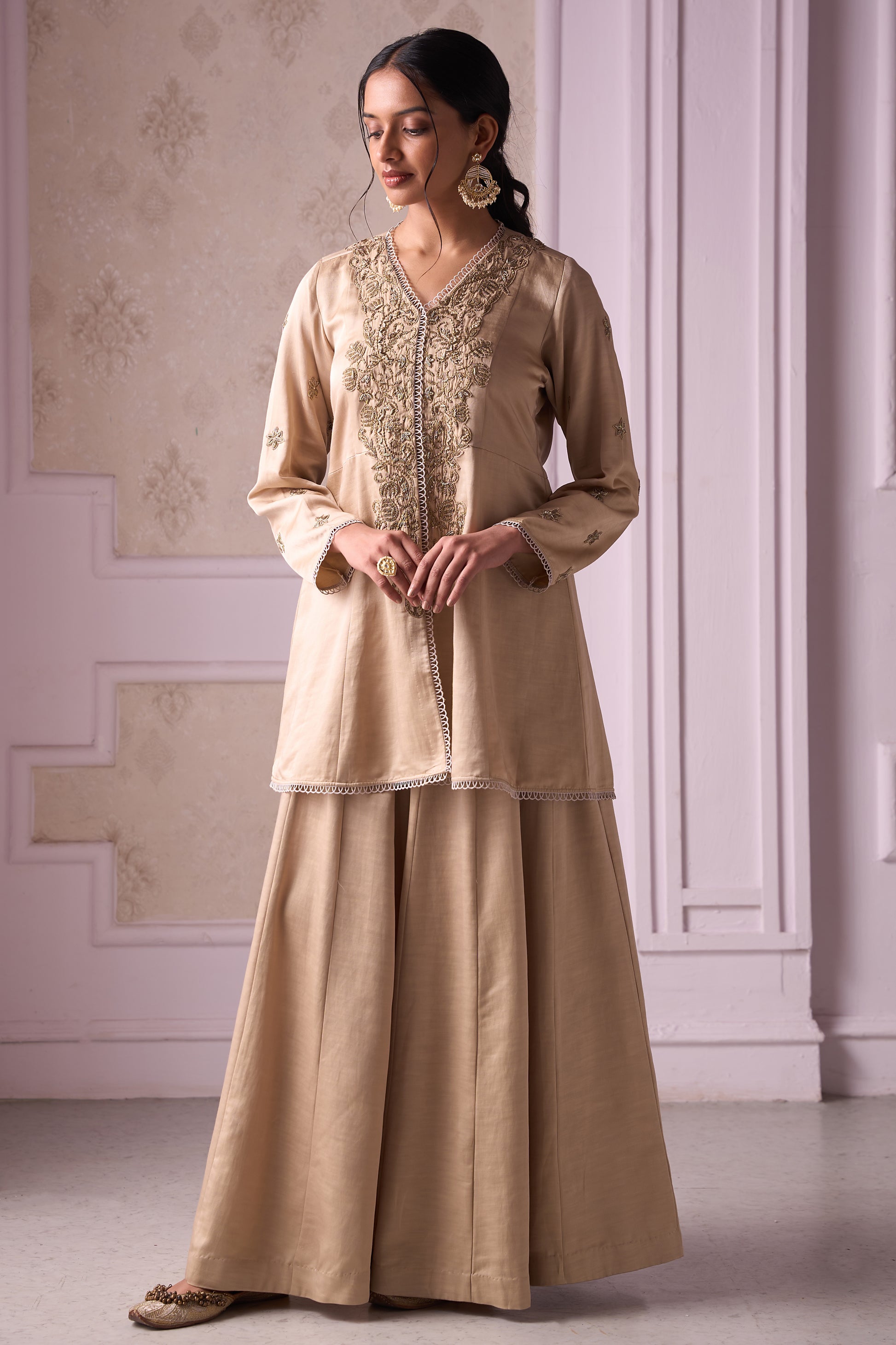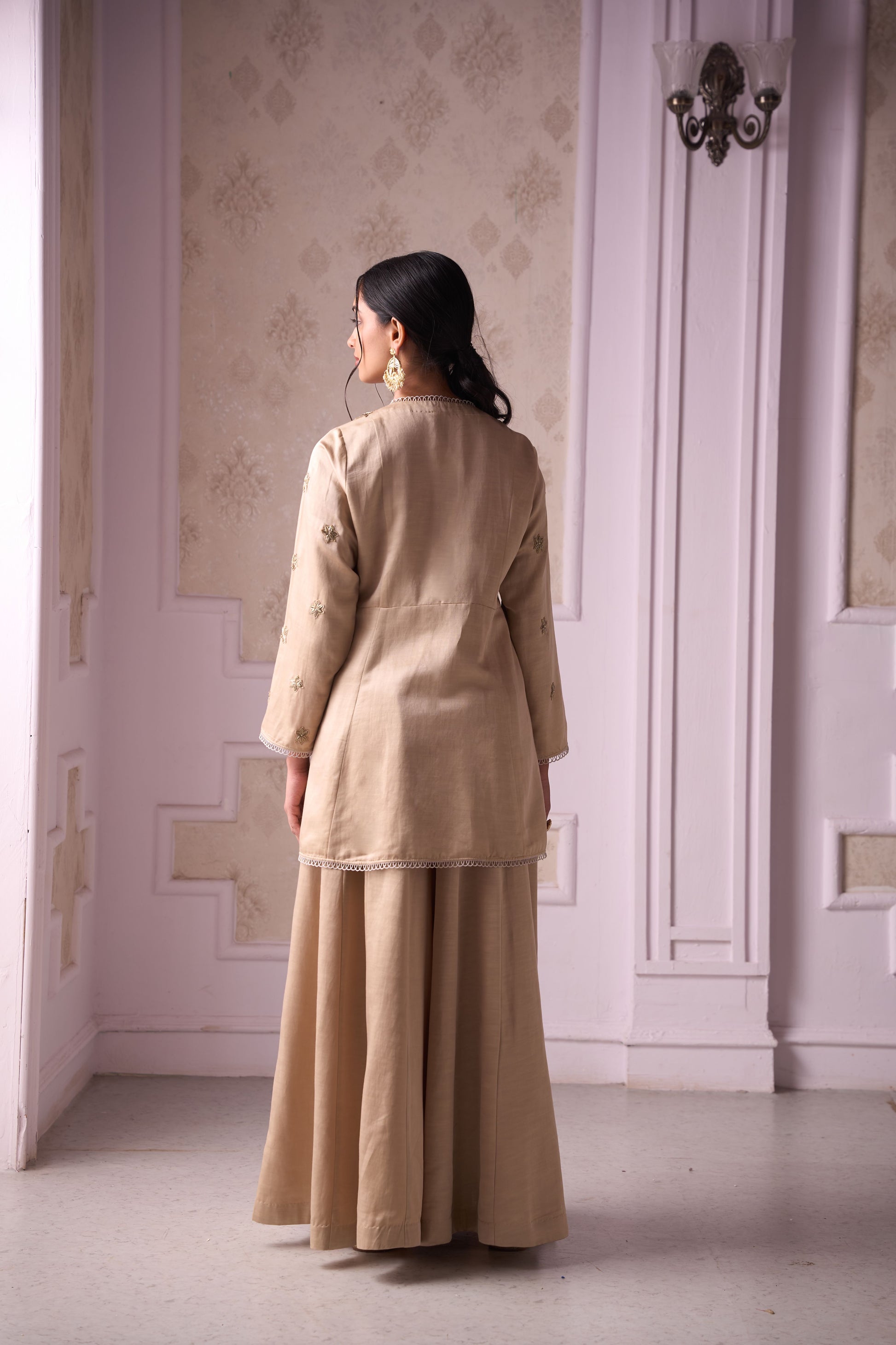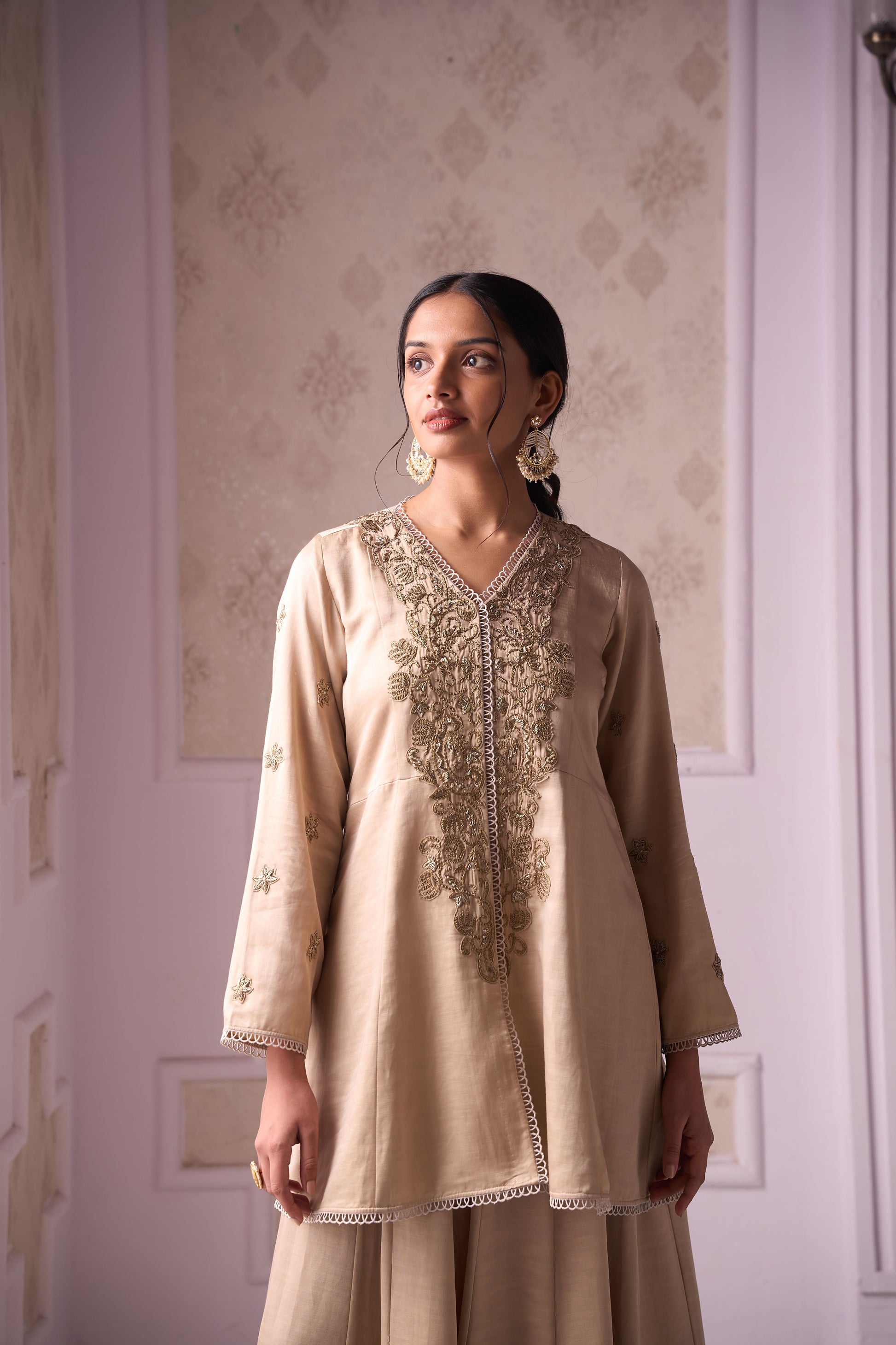A beige linen satin peplum kurta with dull gold zardozi and sequin hand embroidery on neckline and sleeves, styled with linen satin sharara.