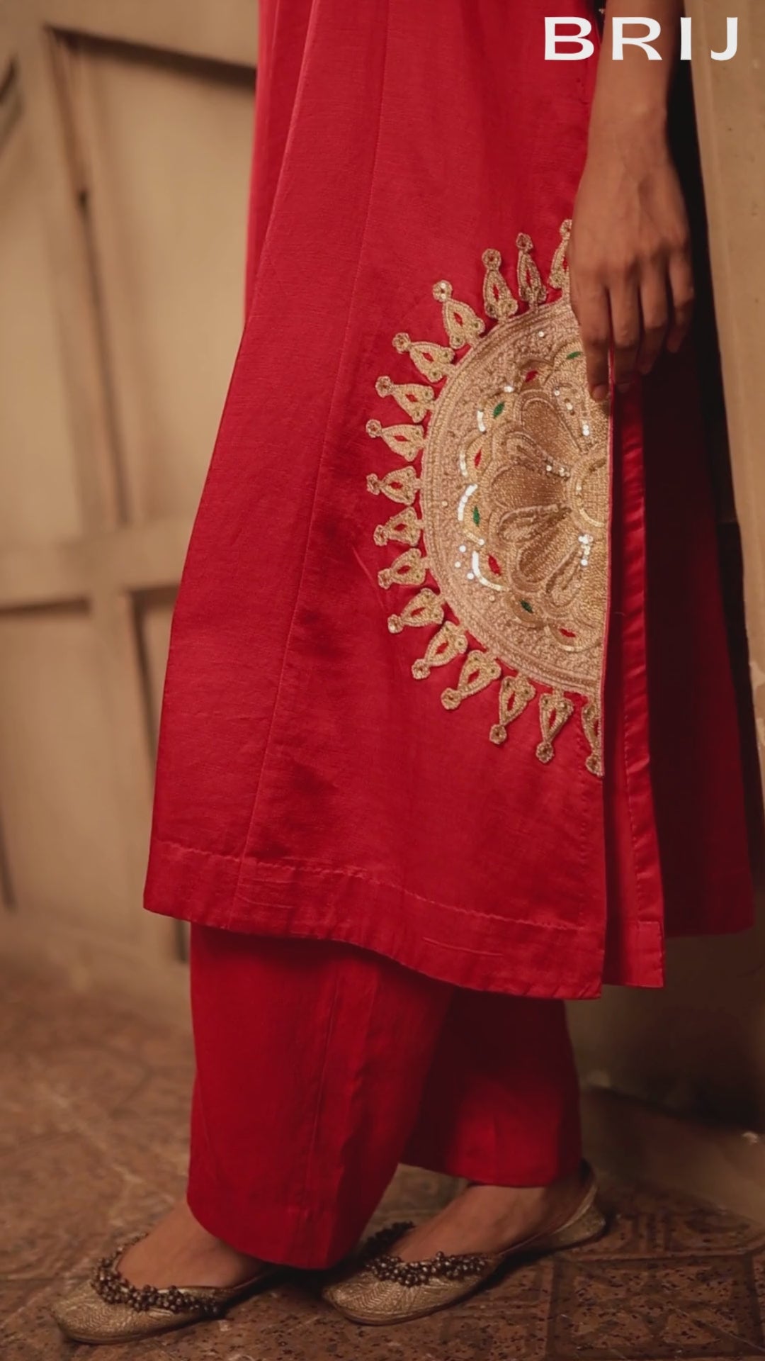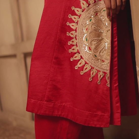 A red linen satin kurta hand embroidered with gold aari and sequins, butas on slits, styled with spun silk bottoms and a kota silk dupatta.