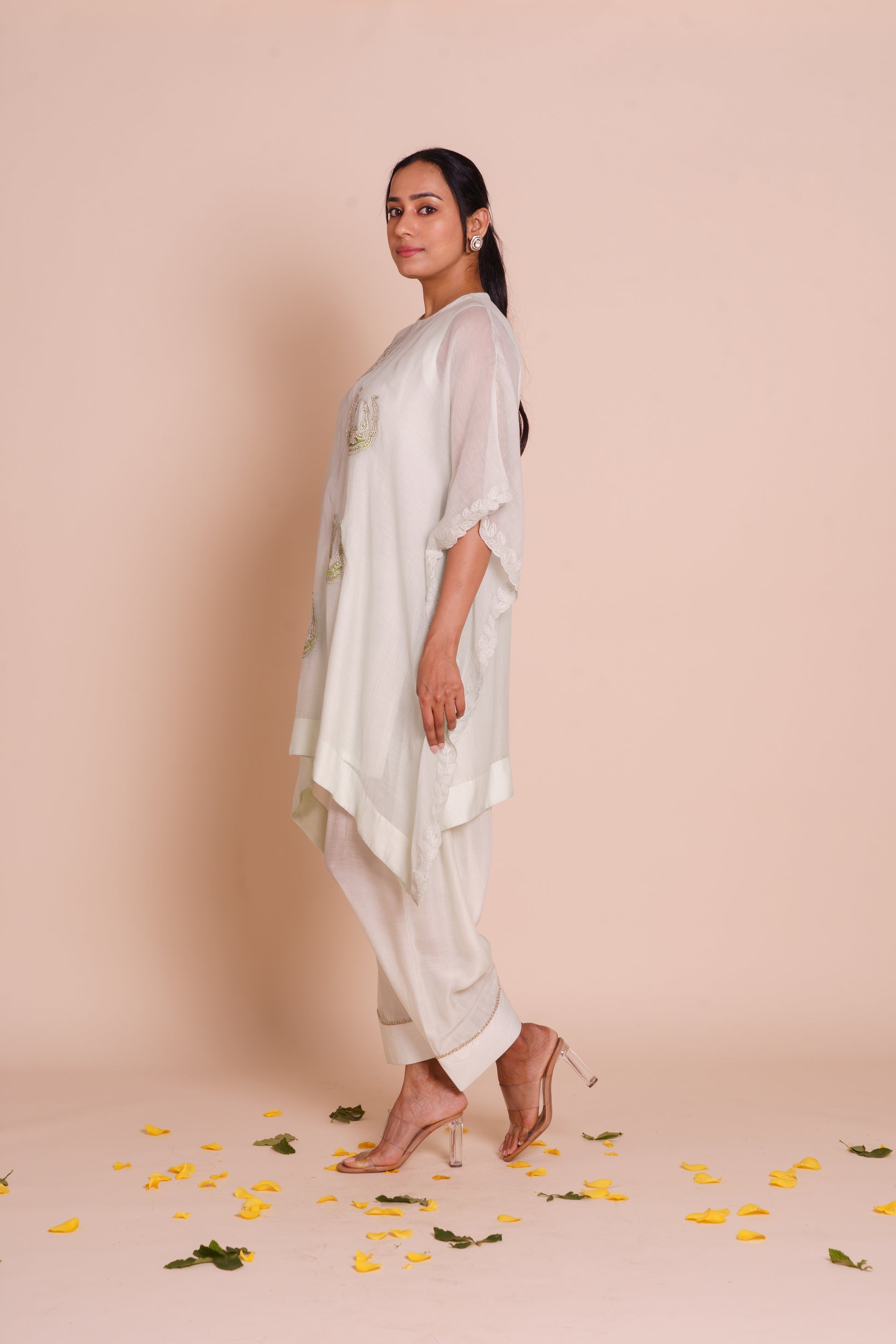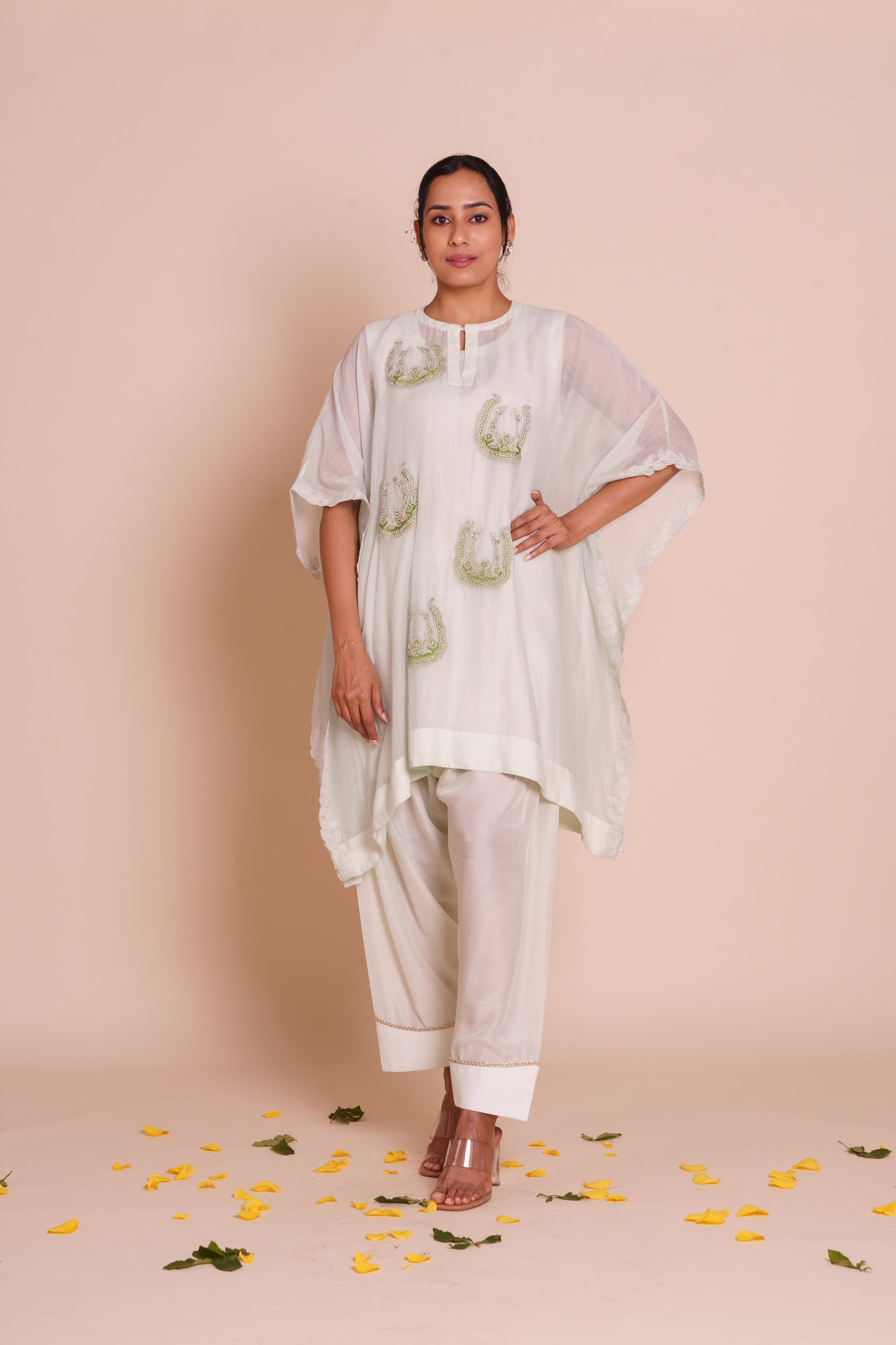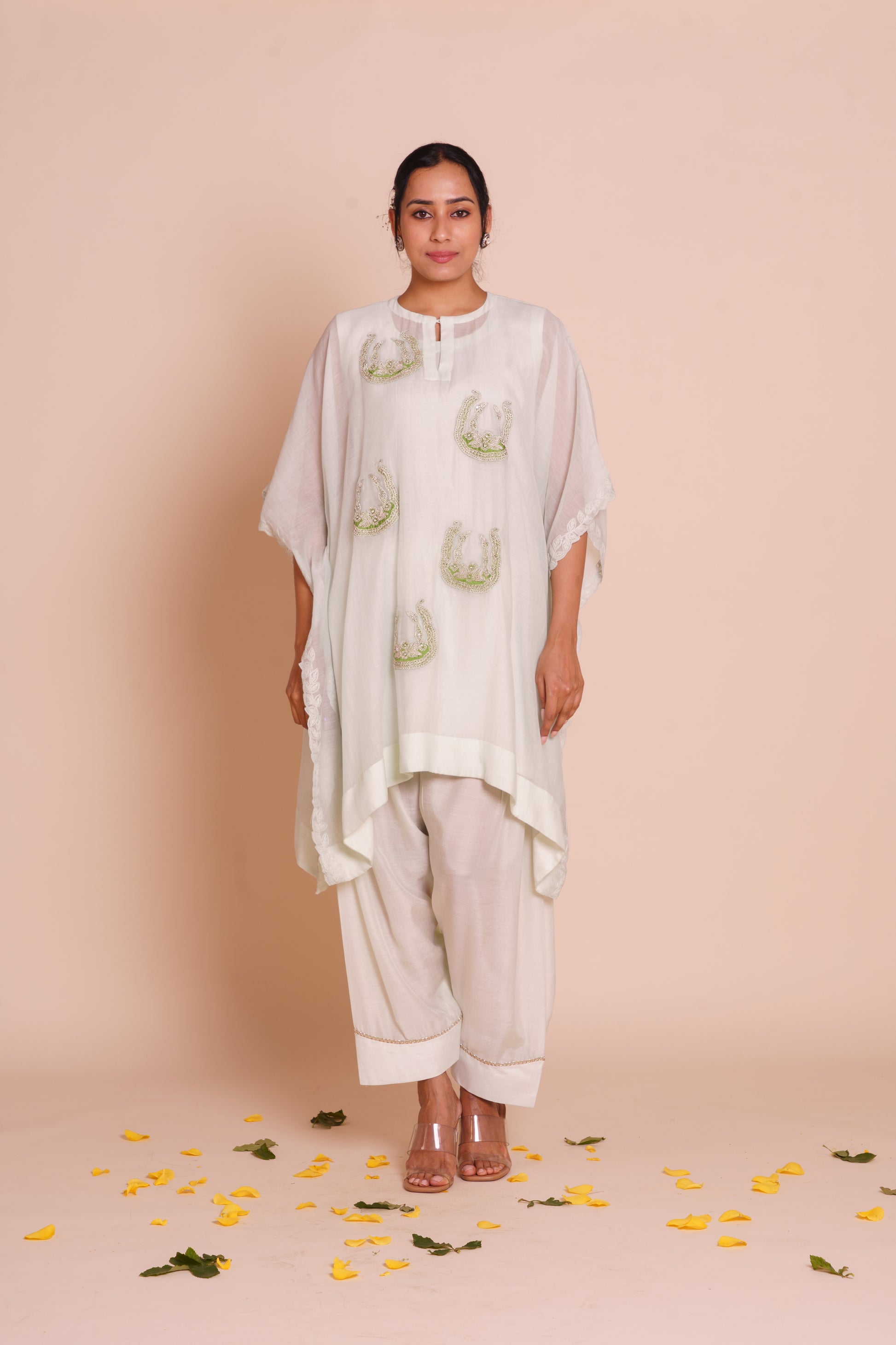 A pastel green kaftan set delicately embroidered with silver dori buta work. Crafted in kora chanderi and paired with muslin silk bottoms, this set radiates effortless grace.