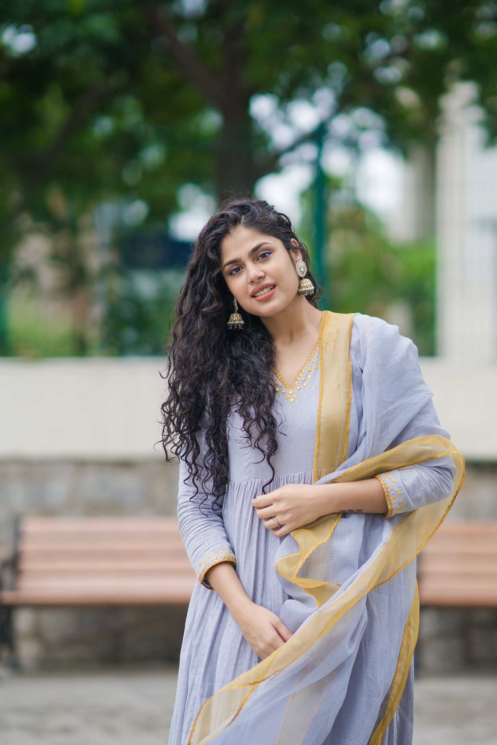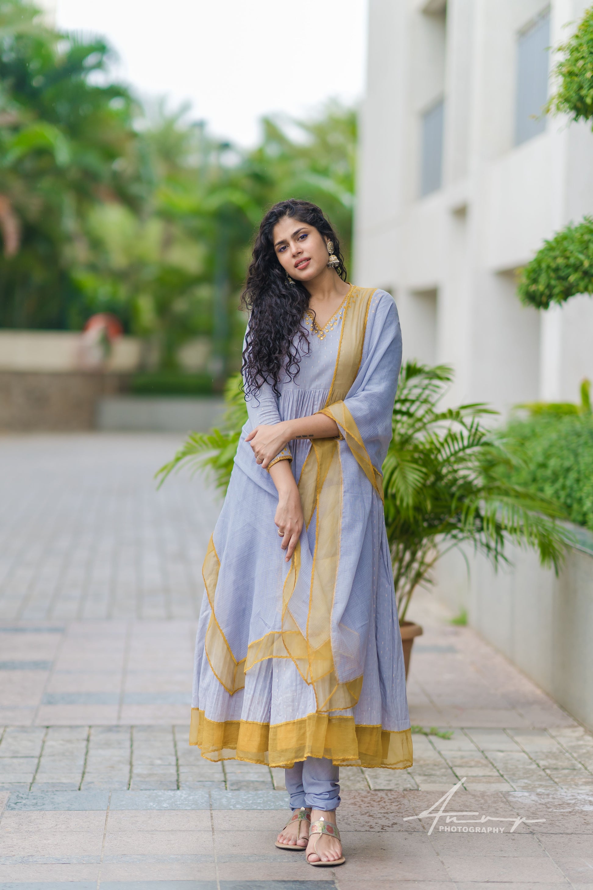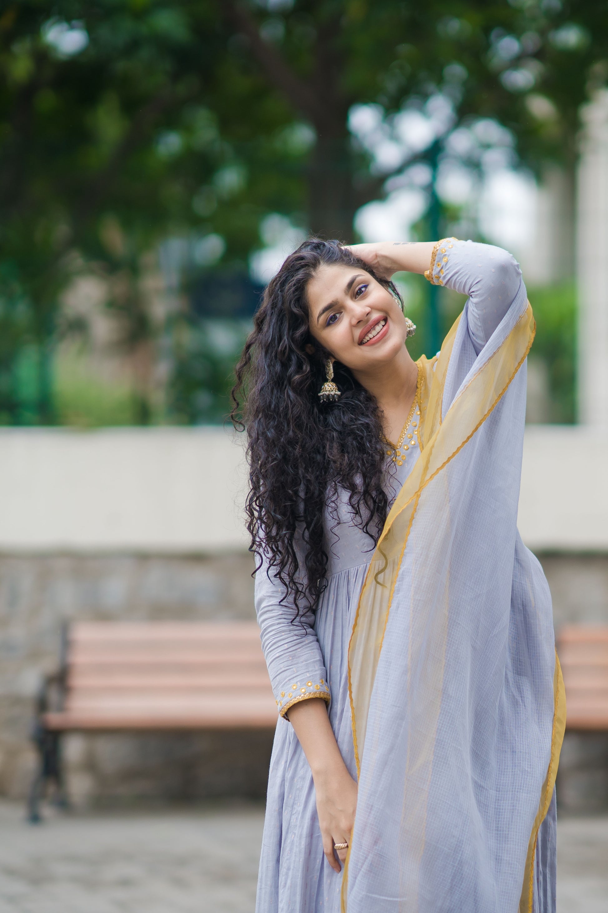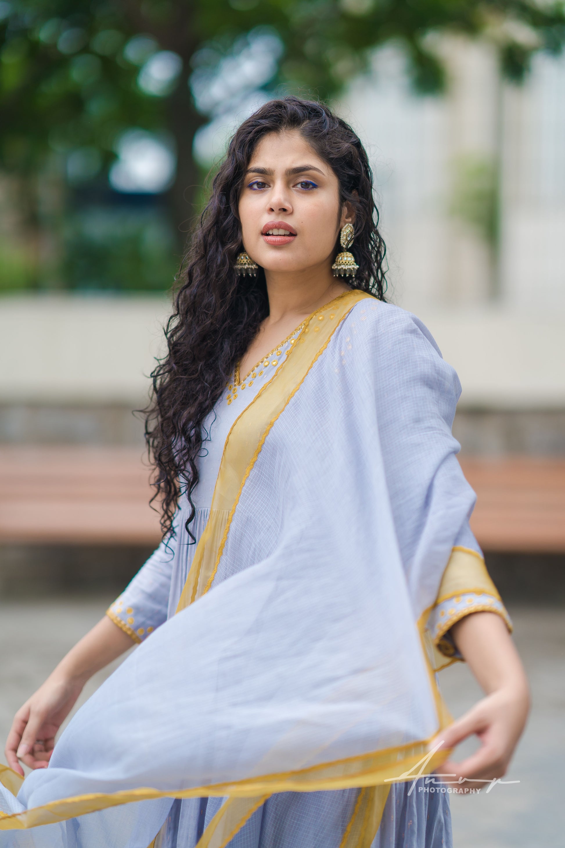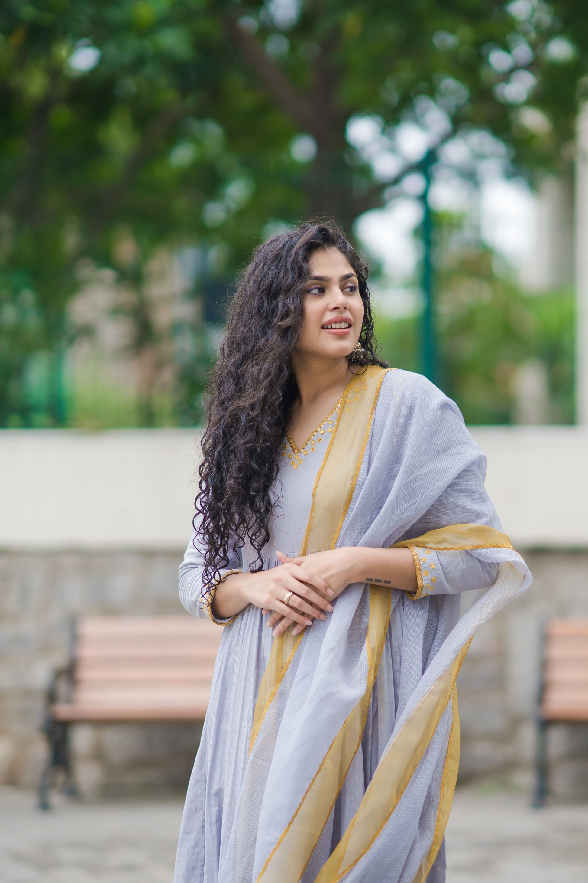 A grey mull zari kalidar paired with an organza dupatta, finished with soft shimmer.