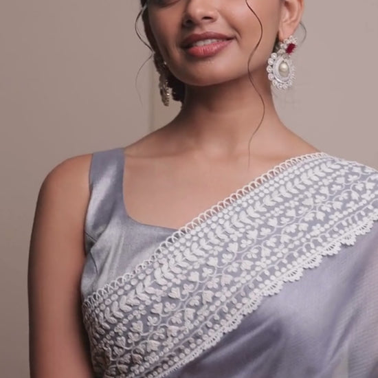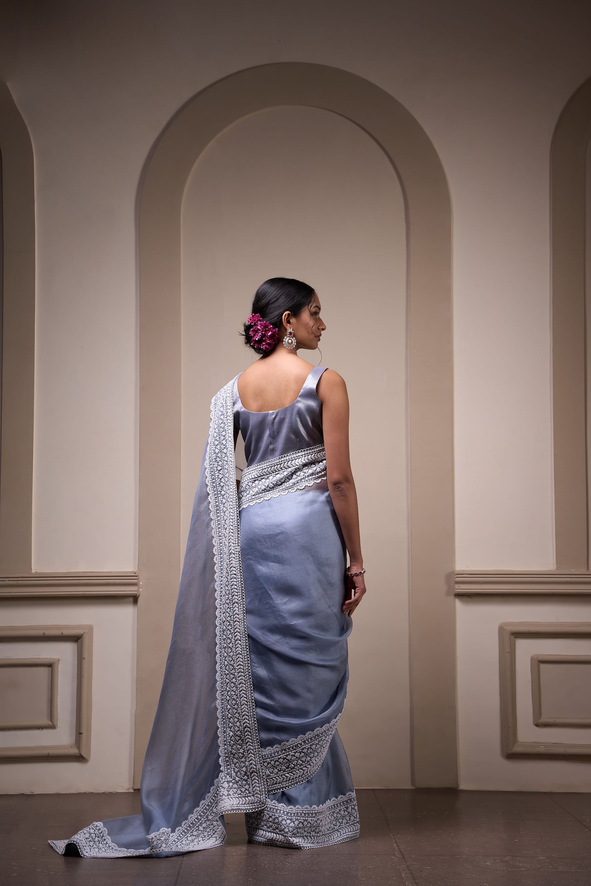 A grey kota silk sari with silver dori embroidery, styled with a kanchi tissue blouse