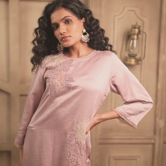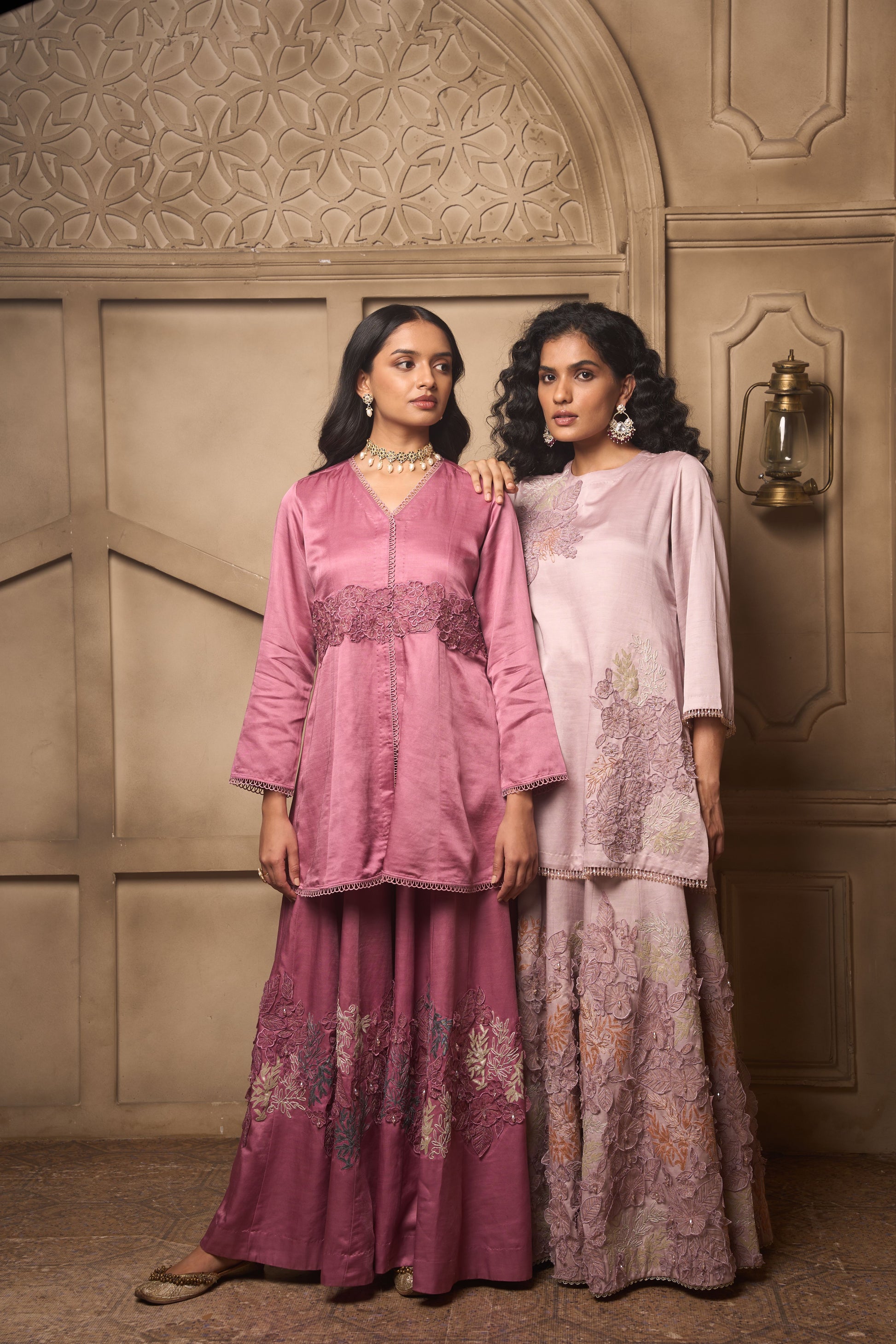 A lavender linen satin short kurti with silver dori and rose gold 3d floral machine embroidery, paired with a matching linen satin sharara.