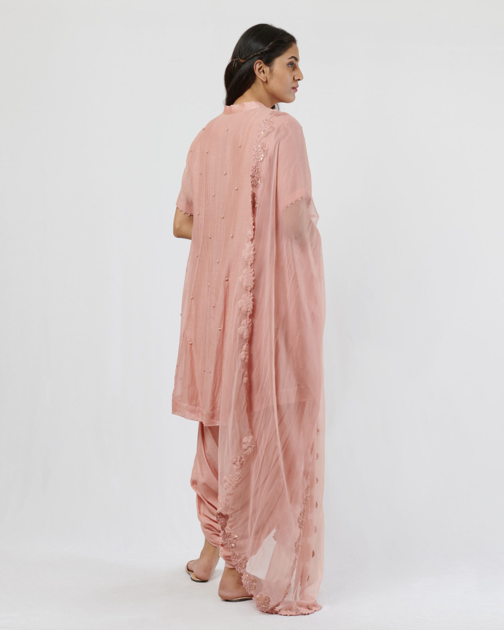 Hand crafted potlis highlighted with sequins all over the front and the back of the kurta. Chiffon dupatta hand thread embroidered border on all four sides of the dupatta. Loops trim detail on placket and sleeves hemline