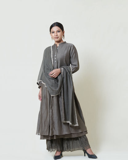 Self fabric applique and cutwork detail at the hemline and the sleeves *silver kora and metal sequins with gold aari scalloped detail embroidered dupatta. Layered detail on kurta and sleeves. Scalloped dabka faresha border hand embroidered on dupatta. Platead detail on the bodice