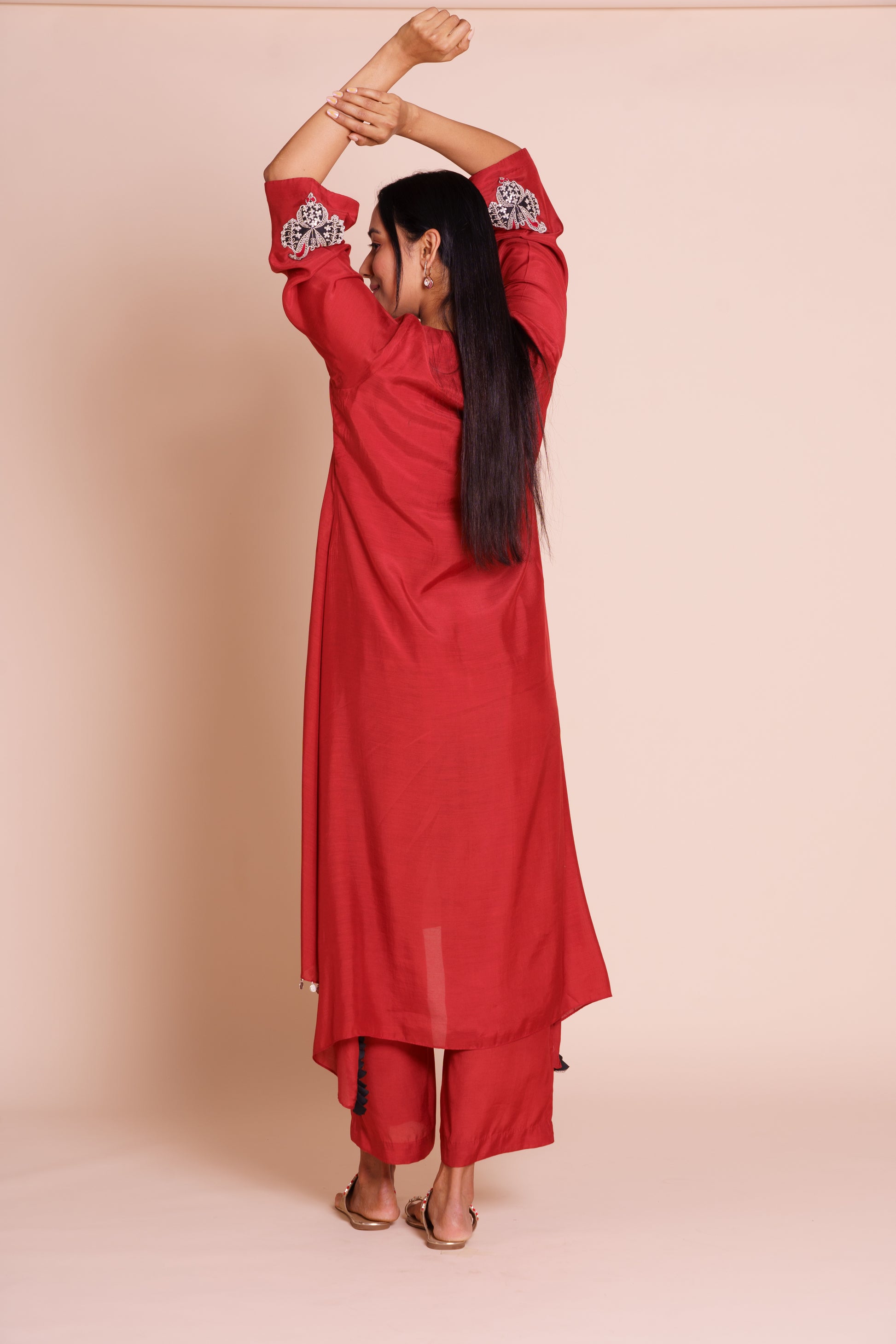 A rich rustish red muslin kurta set, accentuated with silver dori hand-embroidered buta motifs on the neckline and sleeves. A refined choice for timeless elegance.